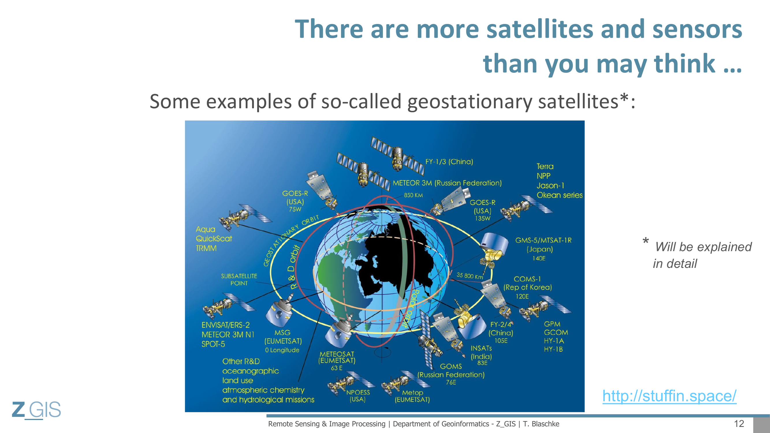 Slide 12 vermittelt einen ersten Eindruck von der Vielfalt der Satellitenflotte: Es gibt weit mehr Satelliten und Sensoren, als man zunächst denken würde. Die Slide zeigt zahlreiche geostationäre Satelliten verschiedener Länder und Organisationen: GOES-R (USA), MSG und METEOSAT (EUMETSAT, Europa), FY-1/3 (China), METEOR 3M (Russische Föderation), GMS-5/MTSAT-1R (Japan), COMS-1 (Südkorea), INSATs (Indien), und viele weitere. Dazu kommen polarumlaufende Satelliten wie Terra, NPP, Jason-1, Aqua, ENVISAT/ERS-2, SPOT-5 und andere, die auf niedrigeren Orbits fliegen. Geostationäre Satelliten kreisen in ca. 35.800 km Höhe und beobachten immer denselben Erdausschnitt, während polarumlaufende Satelliten in ca. 700-900 km Höhe die gesamte Erde systematisch abtasten.