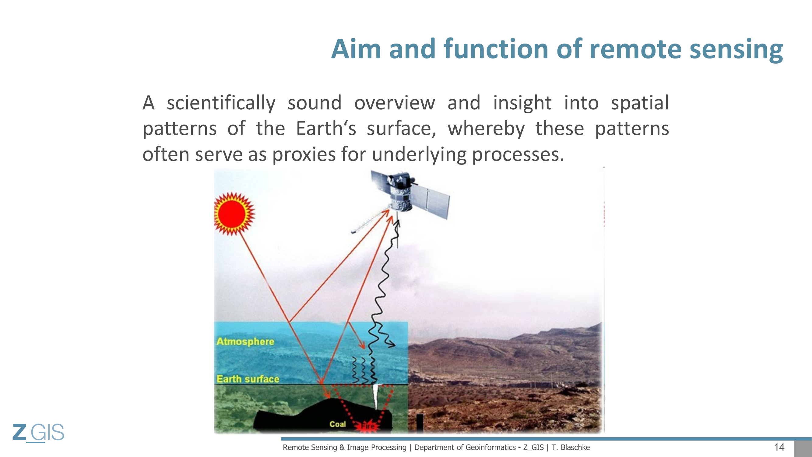 Slide 14 definiert das übergeordnete Ziel der Fernerkundung: Sie liefert einen wissenschaftlich fundierten Überblick und Einblick in räumliche Muster der Erdoberfläche, wobei diese Muster oft als Proxies (Stellvertreter) für zugrundeliegende Prozesse dienen. Das Diagramm auf der Slide illustriert den Grundmechanismus: Die Sonne bestrahlt die Erdoberfläche, die Strahlung wird dort reflektiert und von einem Satellitensensor aufgezeichnet. Ein Feuer oder eine Kohlelagerstätte emittiert zusätzlich eigene Strahlung. Der Sensor im Weltraum fängt all diese Signale ein.