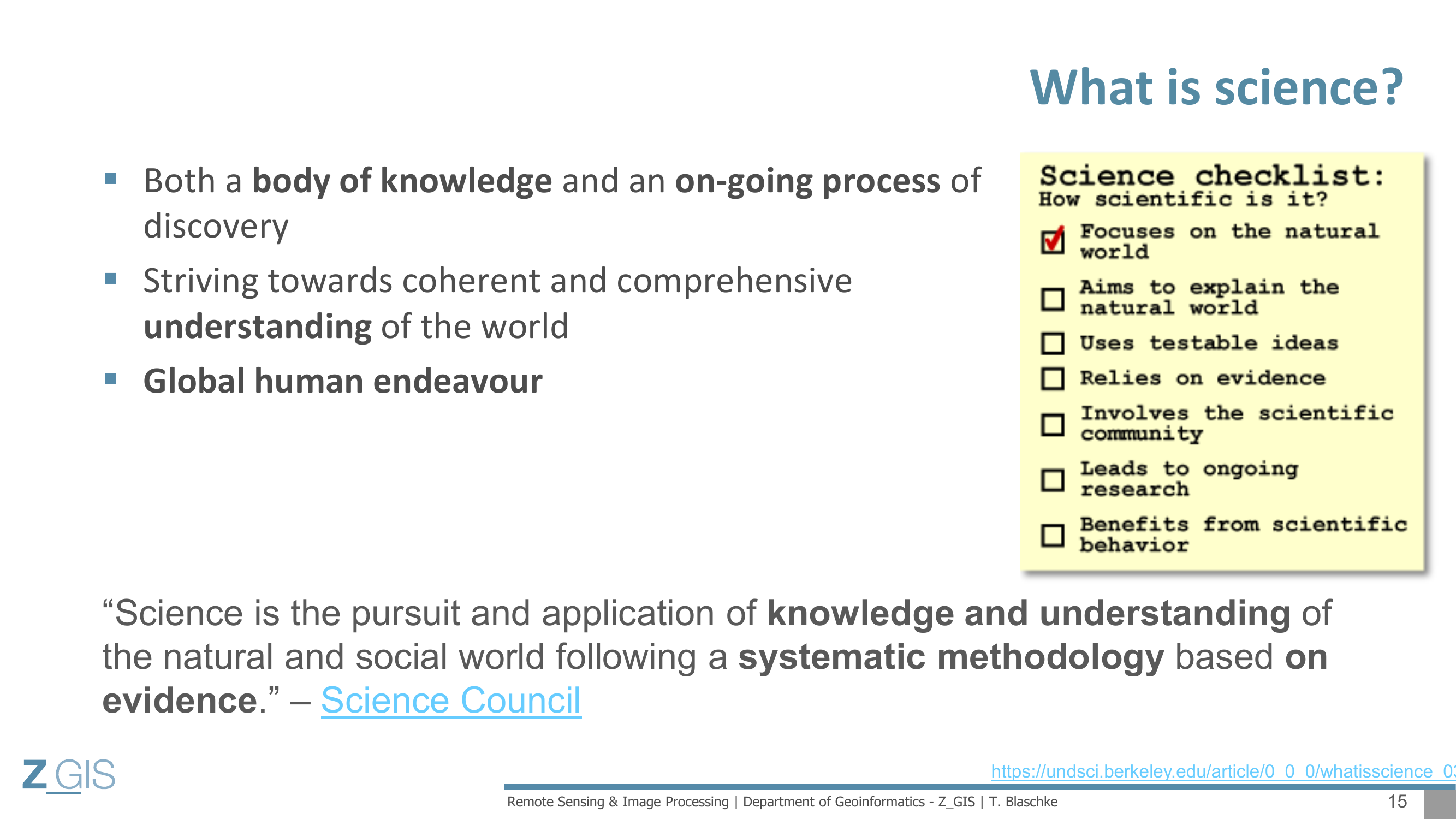 Fernerkundung eingebettet in den wissenschaftlichen Kontext: Slide 15 erinnert daran, was Wissenschaft überhaupt ist - sowohl ein Wissensbestand (Body of Knowledge) als auch ein fortlaufender Prozess der Entdeckung. Sie strebt nach einem kohärenten und umfassenden Verständnis der Welt und ist ein globales menschliches Unterfangen. Das Science Council definiert Wissenschaft als "the pursuit and application of knowledge and understanding of the natural and social world following a systematic methodology based on evidence."