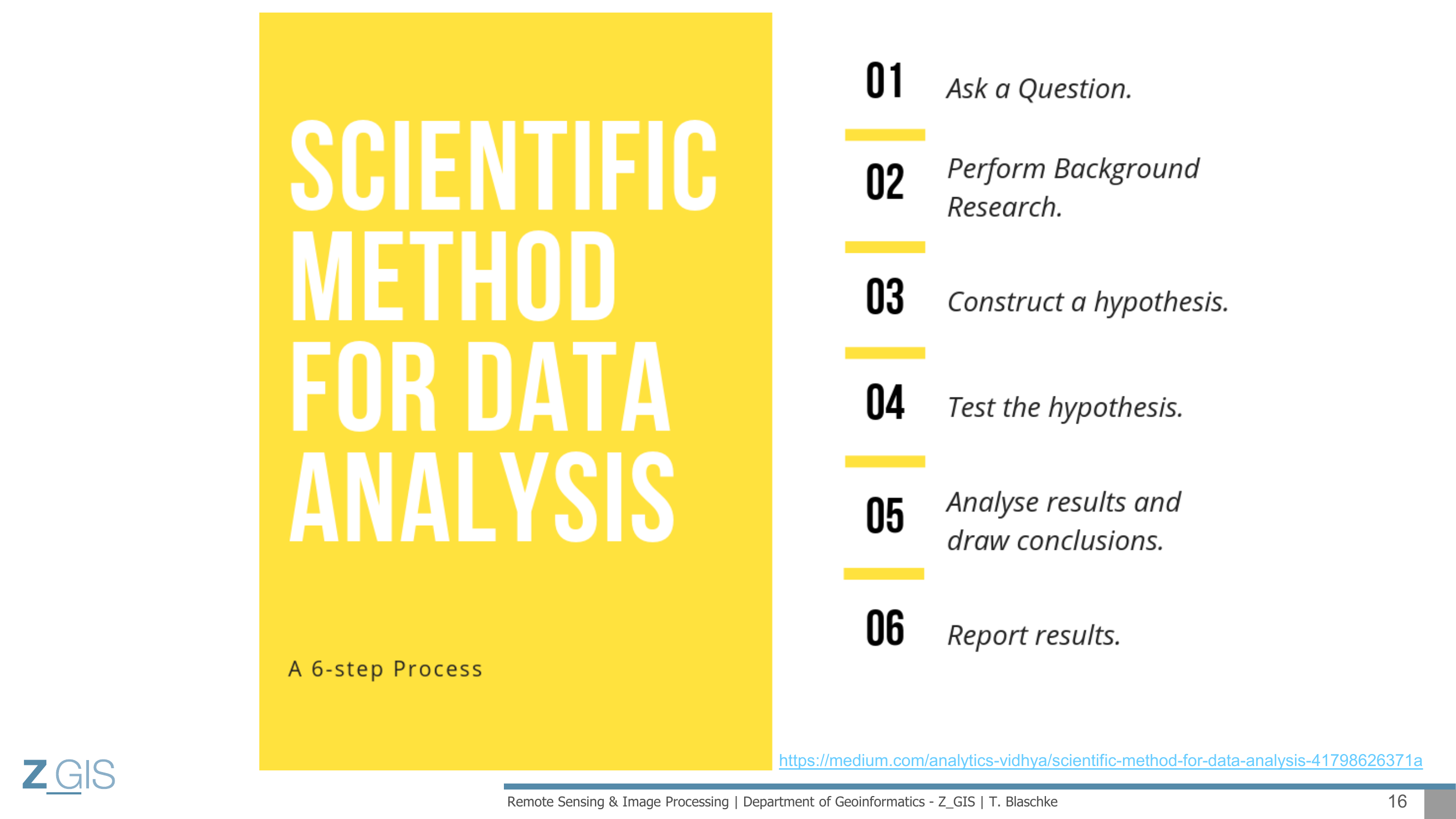 Slide 16 zeigt den klassischen wissenschaftlichen Prozess in sechs Schritten: (1) Frage stellen, (2) Hintergrundforschung durchführen, (3) Hypothese formulieren, (4) Hypothese testen, (5) Ergebnisse analysieren und Schlussfolgerungen ziehen, (6) Ergebnisse berichten. Dieser Prozess gilt auch für die Fernerkundung: Man formuliert eine Forschungsfrage (z.B. "Wie hat sich die Waldfläche in Österreich in den letzten 20 Jahren verändert?"), sammelt Fernerkundungsdaten, verarbeitet und analysiert sie, und berichtet die Ergebnisse.