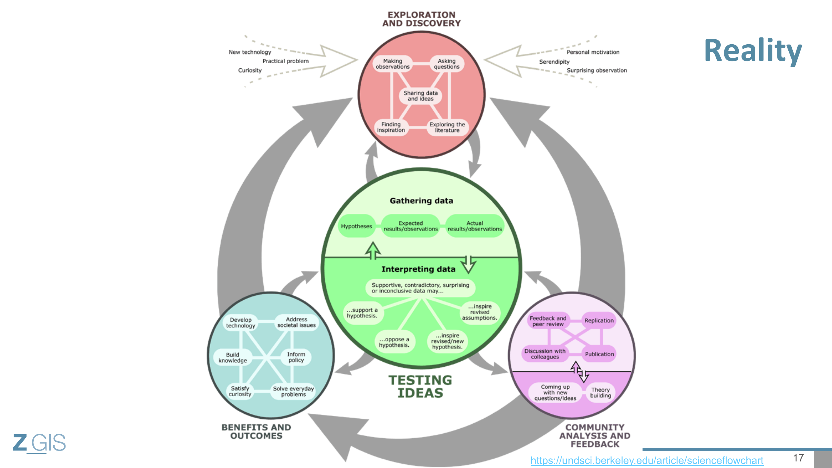 Slide 17 zeigt die Realität des wissenschaftlichen Prozesses: Er ist nicht linear, sondern ein komplexes Zusammenspiel aus Exploration und Entdeckung, Testen von Ideen, Community-Analyse und Feedback sowie Benefits und Outcomes. Neue Technologien, praktische Probleme, Neugierde und überraschende Beobachtungen können den Prozess anstoßen. Die zentrale Schleife besteht aus Datensammlung, Hypothesenprüfung und Dateninterpretation.