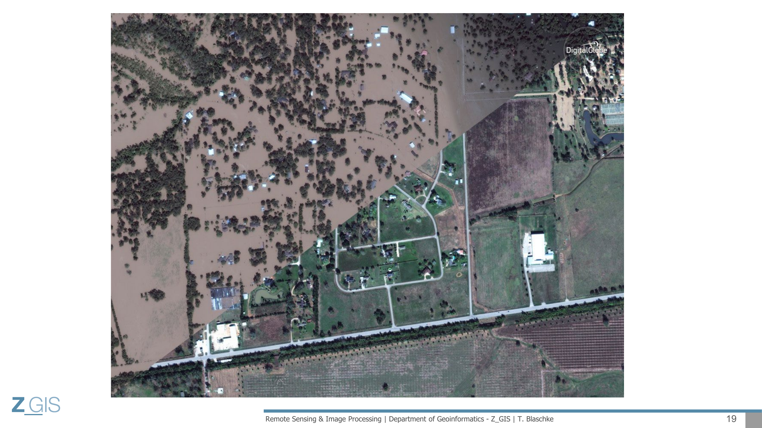 Slide 19 zeigt ein weiteres Beispiel: Eine Überschwemmung, aufgenommen von DigitalGlobe. Man erkennt, wie weite Teile des Gebietes unter Wasser stehen, während einzelne Straßen und höher gelegene Bereiche noch erkennbar sind. Solche Aufnahmen sind für das Katastrophenmanagement unverzichtbar - sie liefern einen sofortigen Überblick über das Ausmaß der Schäden, der am Boden nur mit enormem Aufwand gewonnen werden könnte.