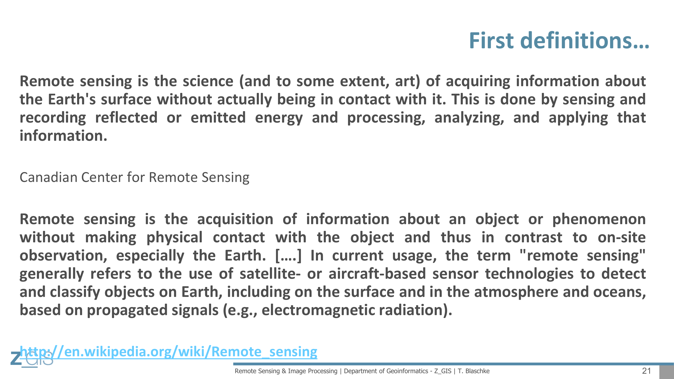 Die zweite Definition, angelehnt an Wikipedia, ergänzt: "Remote sensing is the acquisition of information about an object or phenomenon without making physical contact with the object and thus in contrast to on-site observation, especially the Earth. In current usage, the term 'remote sensing' generally refers to the use of satellite- or aircraft-based sensor technologies to detect and classify objects on Earth, including on the surface and in the atmosphere and oceans, based on propagated signals (e.g., electromagnetic radiation)."
