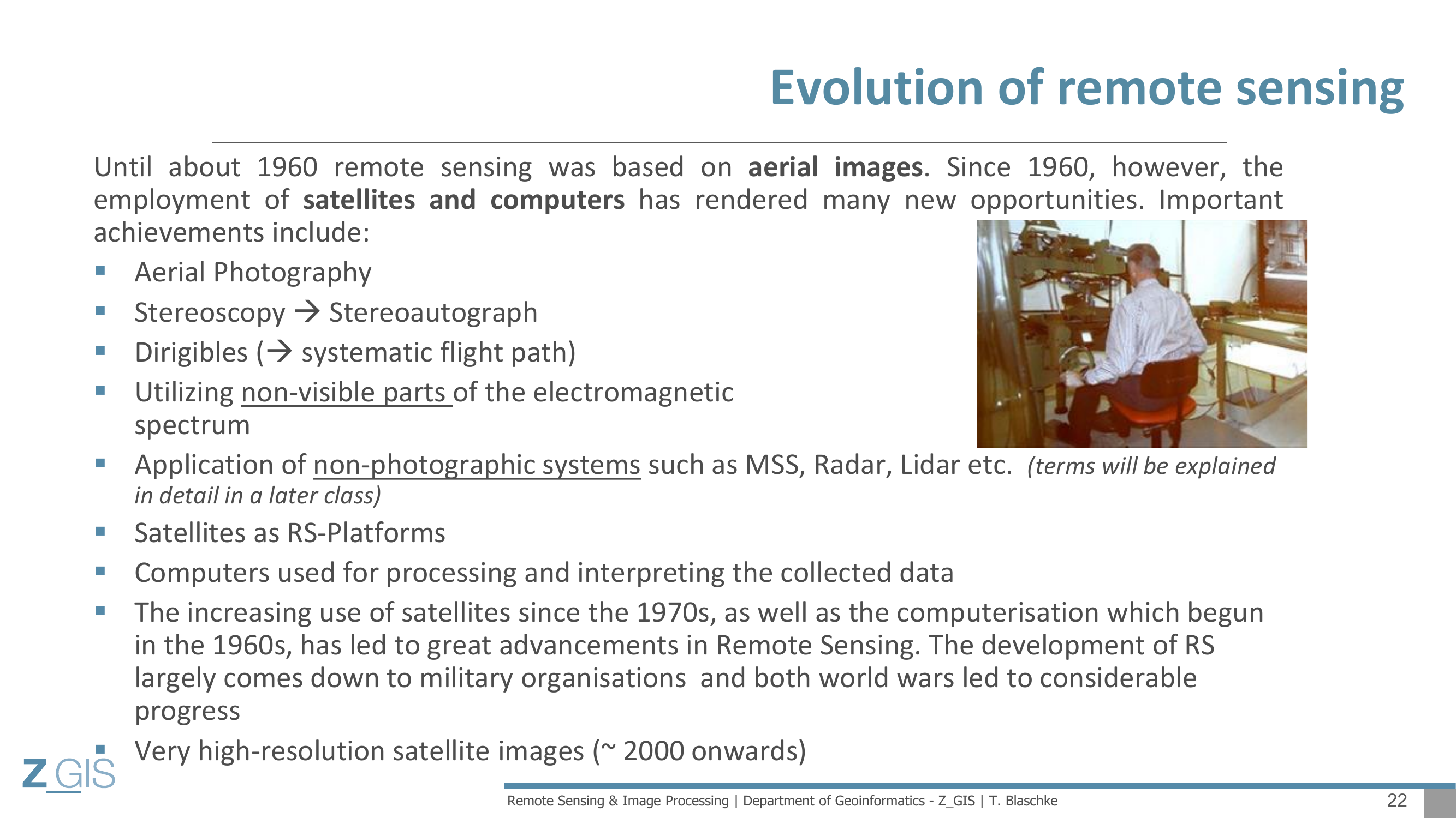 Slide 22 zeigt die Entwicklungsgeschichte der Fernerkundung. Bis etwa 1960 basierte Remote Sensing ausschließlich auf Luftbildern (Aerial Images). Seit 1960 haben der Einsatz von Satelliten und Computern viele neue Möglichkeiten eröffnet. Wichtige Meilensteine waren die Einführung der Luftbildfotografie, Stereoskopie und Stereoautographen, Zeppeline für systematische Flugpfade, die Nutzung nicht-sichtbarer Teile des elektromagnetischen Spektrums, die Anwendung nicht-fotografischer Systeme wie MSS, Radar und LiDAR, Satelliten als RS-Plattformen, Computer zur Verarbeitung und Interpretation gesammelter Daten, der zunehmende Einsatz von Satelliten seit den 1970er-Jahren, und sehr hochauflösende Satellitenbilder ab ca. 2000. Die Entwicklung der Fernerkundung wurde maßgeblich durch militärische Organisationen vorangetrieben, und beide Weltkriege führten zu beträchtlichem Fortschritt.