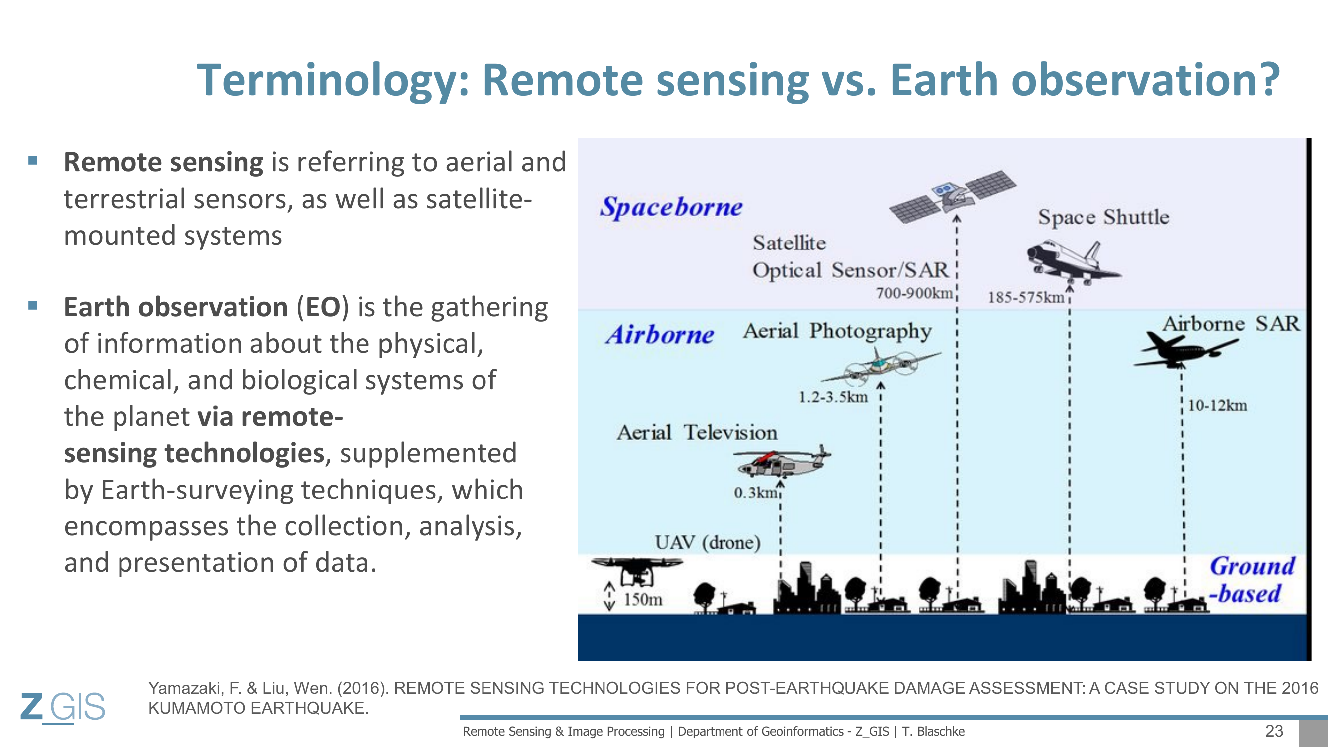 Slide 23 klärt eine wichtige terminologische Unterscheidung, die ebenfalls prüfungsrelevant ist (Fragenkatalog F3, KERN). Remote Sensing ist der Oberbegriff für alle luft-, boden- und weltraumgestützten Fernerkundungssensoren. Der Begriff bezieht sich auf Aerial (Luft), Terrestrial (Boden) und Satellite (Weltraum) basierte Systeme.