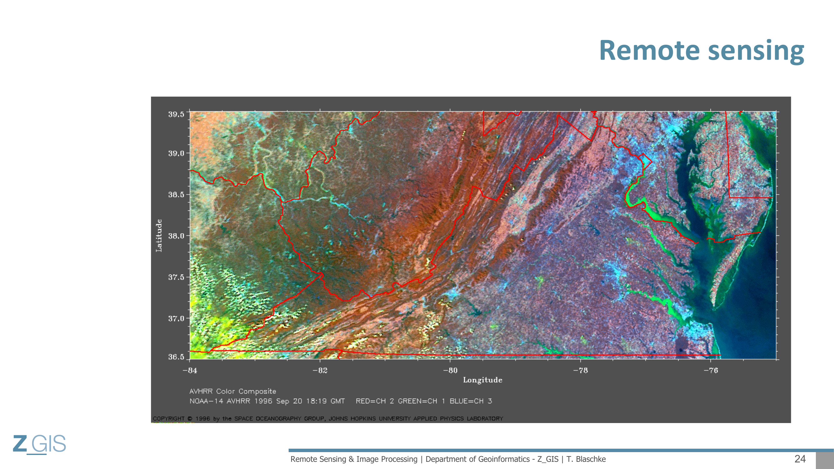 Slide 24 zeigt ein konkretes Beispiel eines Fernerkundungsprodukts: ein AVHRR Color Composite des NOAA-14 Satelliten von 1996. Die Darstellung ist ein Falschfarbenbild (RED=CH 2, GREEN=CH 1, BLUE=CH 3) eines Teils der US-Ostküste. Man sieht verschiedene Landbedeckungstypen in unterschiedlichen Farben - Vegetation, bebaute Gebiete, Gewässer - sowie die Bundesstaatsgrenzen als rote Linien. Solche Produkte sind das Ergebnis des gesamten RS-Prozesses: von der Aufnahme im All bis zur fertigen, interpretierbaren Darstellung.
