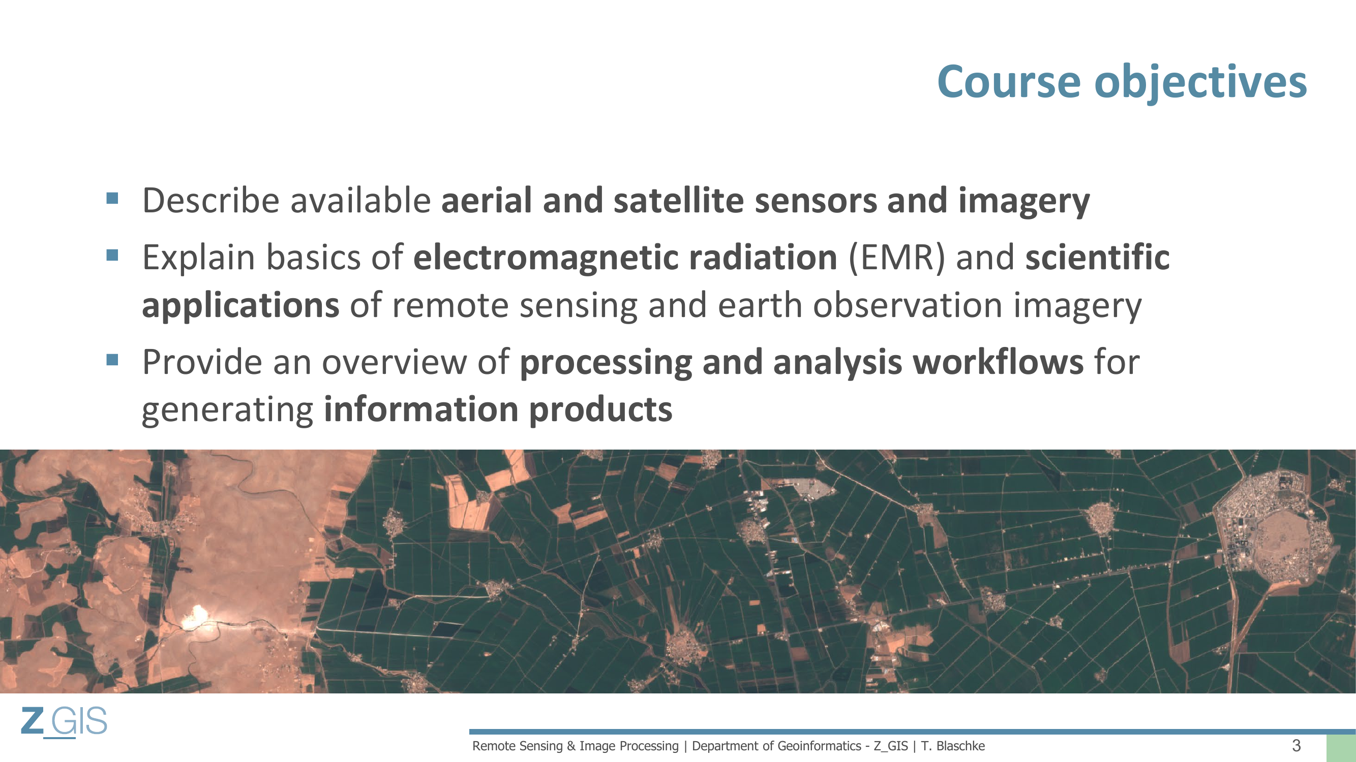 Slide 3 fasst die Kursziele zusammen: Die Vorlesung beschreibt verfügbare Luft- und Satellitensensoren sowie deren Bildprodukte, erklärt die Grundlagen der elektromagnetischen Strahlung und wissenschaftliche Anwendungen von Fernerkundungs- und Erdbeobachtungsbildern, und gibt einen Überblick über Verarbeitungs- und Analyseworkflows zur Erzeugung von Informationsprodukten (Information Products).