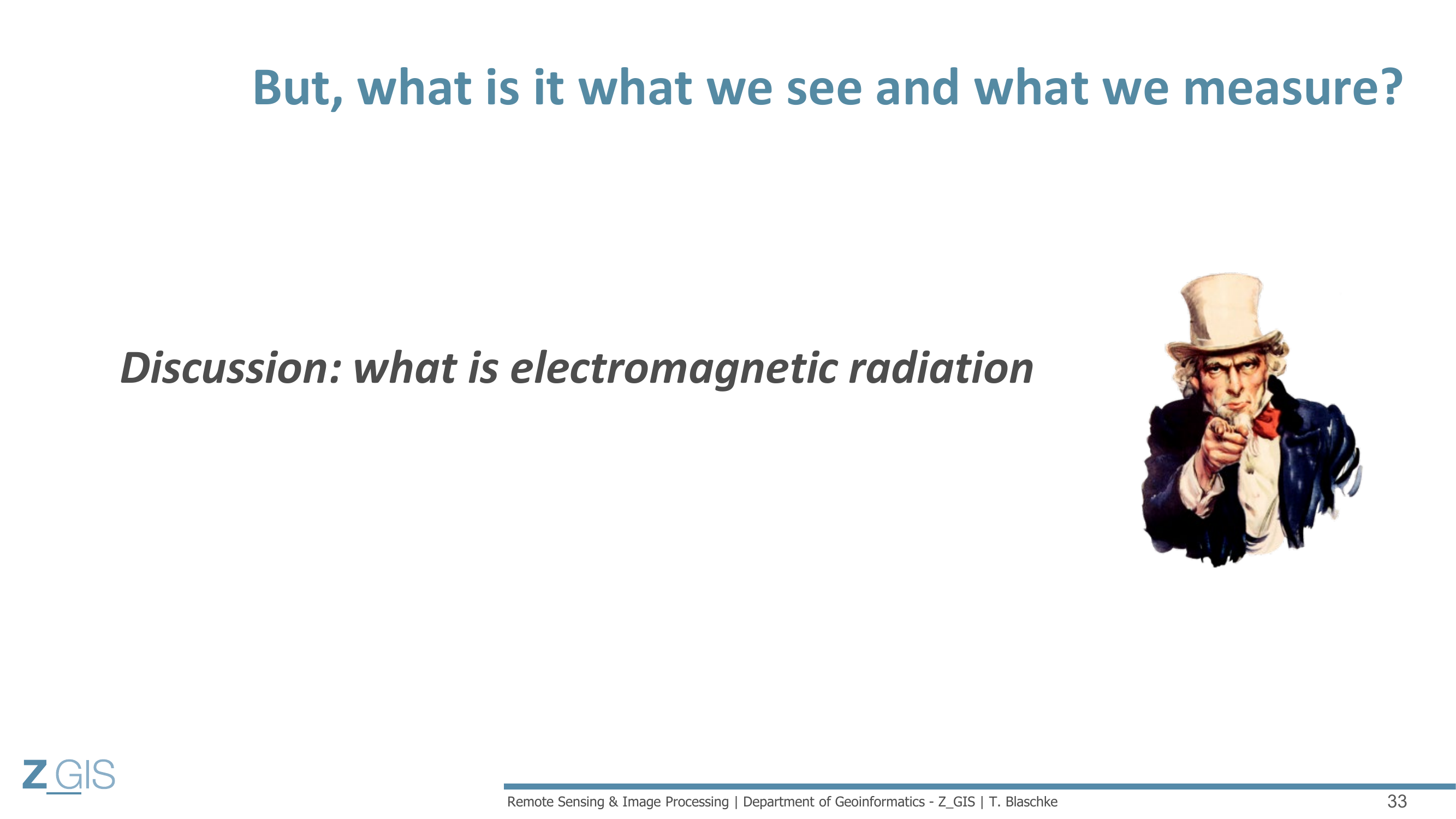 Slide 33 leitet den zweiten Teil der Vorlesung ein mit der zentralen Frage: "But, what is it what we see and what we measure?" - Was ist es eigentlich, das wir sehen und messen? Die Antwort lautet: elektromagnetische Strahlung. Alles, was Fernerkundungssensoren aufzeichnen, ist letztlich EMR in verschiedenen Wellenlängenbereichen und Intensitäten. Die physikalischen Details - Wellenmodell, Teilchenmodell, elektromagnetisches Spektrum, Strahlungsgesetze - werden in L2 und L3 ausführlich behandelt. Die drei Grundformeln der EMR sind prüfungsrelevant (Fragenkatalog F9, KERN und PROF-TIPP): c = Lambda mal Ny (Lichtgeschwindigkeit = Wellenlänge mal Frequenz), Ny = c/Lambda (Frequenz = Lichtgeschwindigkeit geteilt durch Wellenlänge), und Q = h mal f (Energie = Plancksche Konstante mal Frequenz).