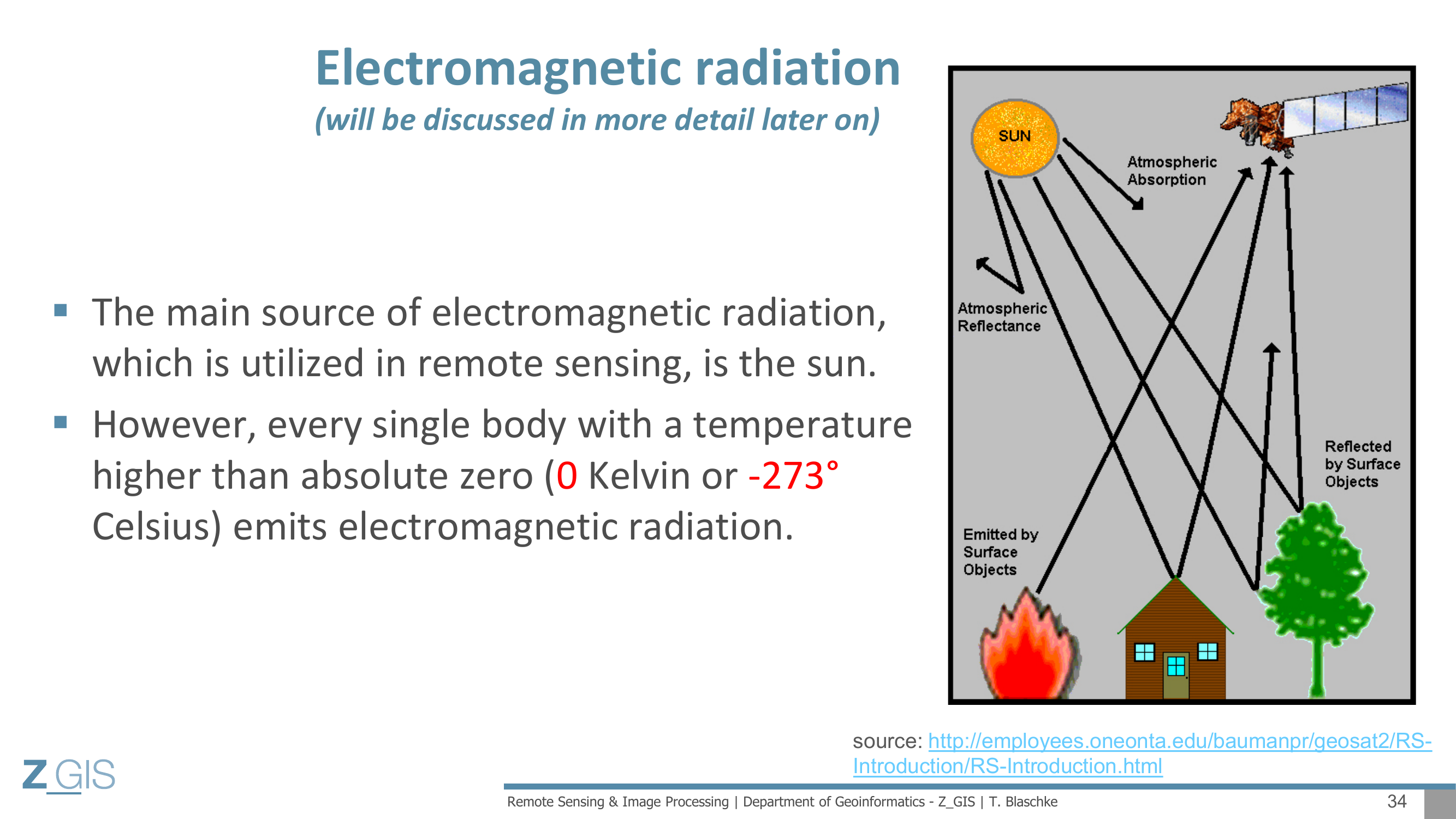 Slide 34 zeigt das Grundprinzip: Die Hauptquelle elektromagnetischer Strahlung für die Fernerkundung ist die Sonne. Allerdings sendet jeder Körper mit einer Temperatur über dem absoluten Nullpunkt (0 Kelvin bzw. -273 Grad Celsius) elektromagnetische Strahlung aus. Auf der Slide sieht man ein Schema, das die verschiedenen Wege der Strahlung illustriert: Die Sonne sendet Strahlung aus, die auf die Atmosphäre trifft. Dort wird ein Teil absorbiert (Atmospheric Absorption), ein Teil reflektiert (Atmospheric Reflectance). Die Strahlung, die die Erdoberfläche erreicht, wird dort von Objekten reflektiert (Reflected by Surface Objects) oder emittiert (Emitted by Surface Objects) - z.B. von einem Feuer oder einem Gebäude. Der Sensor im Weltraum oder in der Luft empfängt diese Strahlung und zeichnet sie auf.
