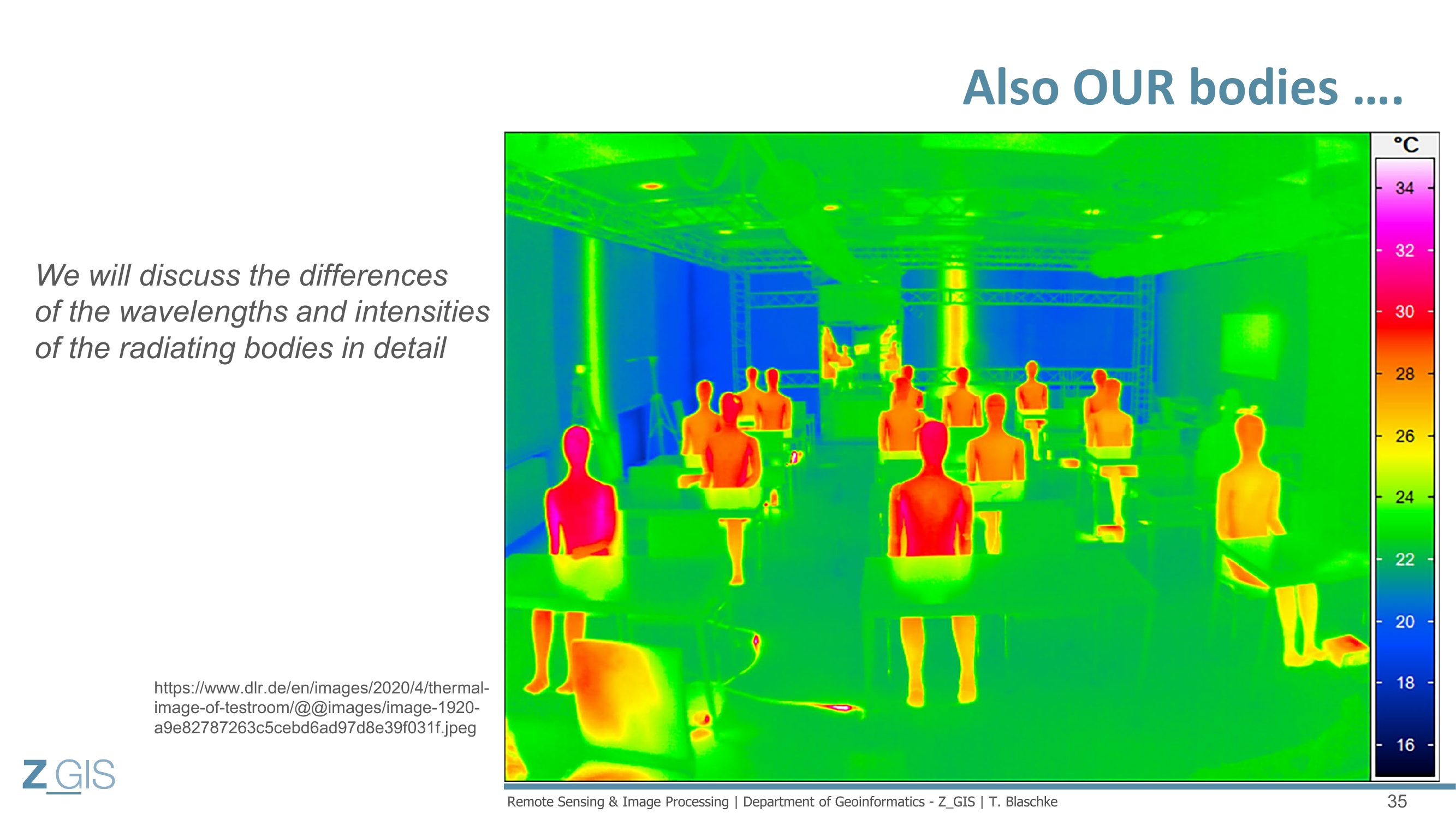Slide 35 verdeutlicht das Prinzip der thermischen Strahlung eindrucksvoll: Ein Thermalbild zeigt Menschen in einem Raum. Die menschlichen Körper erscheinen in Rot und Orange (ca. 30-34 Grad Celsius), während die Umgebung kühler ist (Grün, ca. 20-22 Grad Celsius). Auch unsere Körper senden also elektromagnetische Strahlung aus - im thermalen Infrarotbereich. Die Intensität und Wellenlänge dieser Strahlung hängt von der Temperatur des strahlenden Körpers ab. Diesen Unterschied in Wellenlänge und Intensität verschiedener strahlender Körper wird in den folgenden Vorlesungen im Detail behandelt.