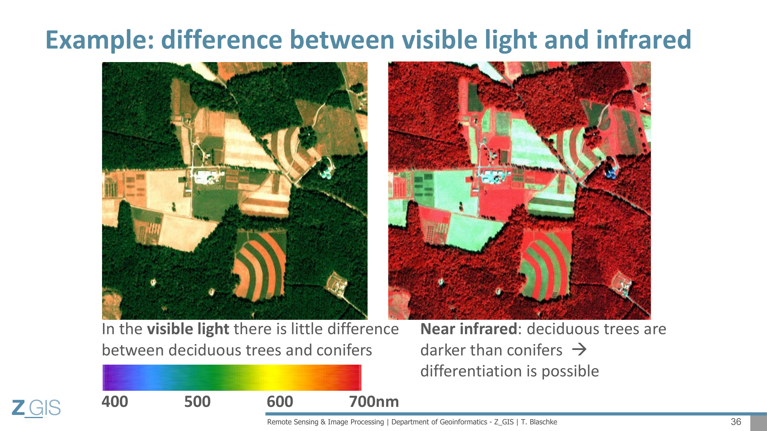 Slide 36 zeigt ein besonders anschauliches Beispiel für den Mehrwert der Fernerkundung gegenüber dem bloßen Auge. Links sieht man ein Luftbild im sichtbaren Licht (Visible Light, VIS, 400-700 nm): Wald, Felder und Gebäude sind erkennbar, aber Laub- und Nadelbäume sehen sehr ähnlich aus. Rechts dasselbe Gebiet im nahen Infrarot (Near Infrared, NIR): Plötzlich erscheinen Laubbäume deutlich dunkler als Nadelbäume - eine Differenzierung wird möglich. Der Grund liegt im unterschiedlichen Reflexionsverhalten der Blattstrukturen: Laubblätter reflektieren NIR-Strahlung anders als Nadeln. Dieses Beispiel verdeutlicht, warum die Erfassung jenseits des sichtbaren Lichts so wertvoll ist - man gewinnt Informationen, die dem menschlichen Auge verborgen bleiben.