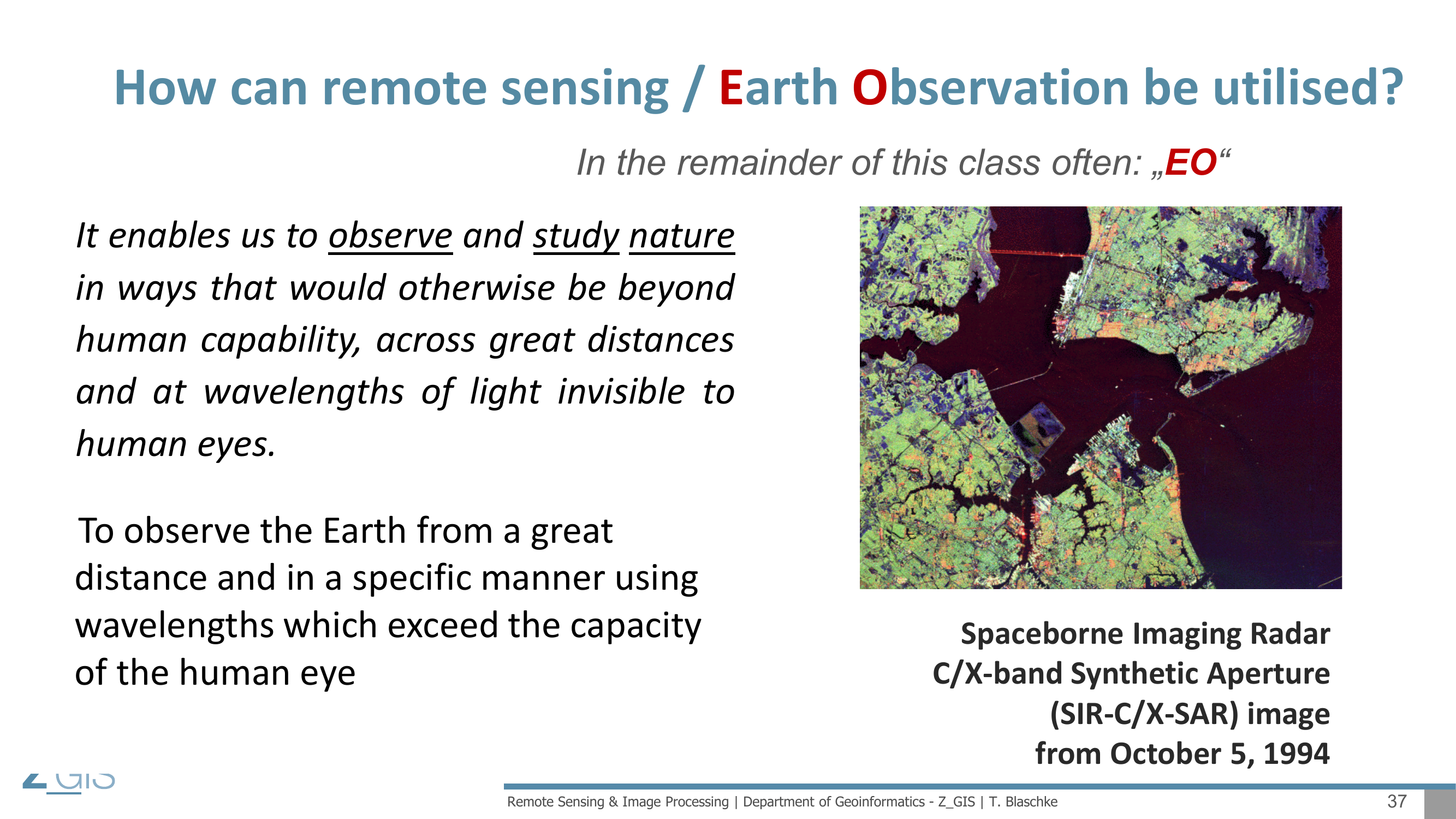 Slide 37 bringt die zentrale Botschaft auf den Punkt: Remote Sensing bzw. Earth Observation ermöglicht es uns, die Natur auf eine Weise zu beobachten und zu studieren, die sonst jenseits menschlicher Fähigkeiten läge - über große Entfernungen und bei Wellenlängen, die für das menschliche Auge unsichtbar sind. Die Slide zeigt ein Spaceborne Imaging Radar C/X-band Synthetic Aperture (SIR-C/X-SAR) Bild von 1994 als Beispiel für Radarfernerkundung.