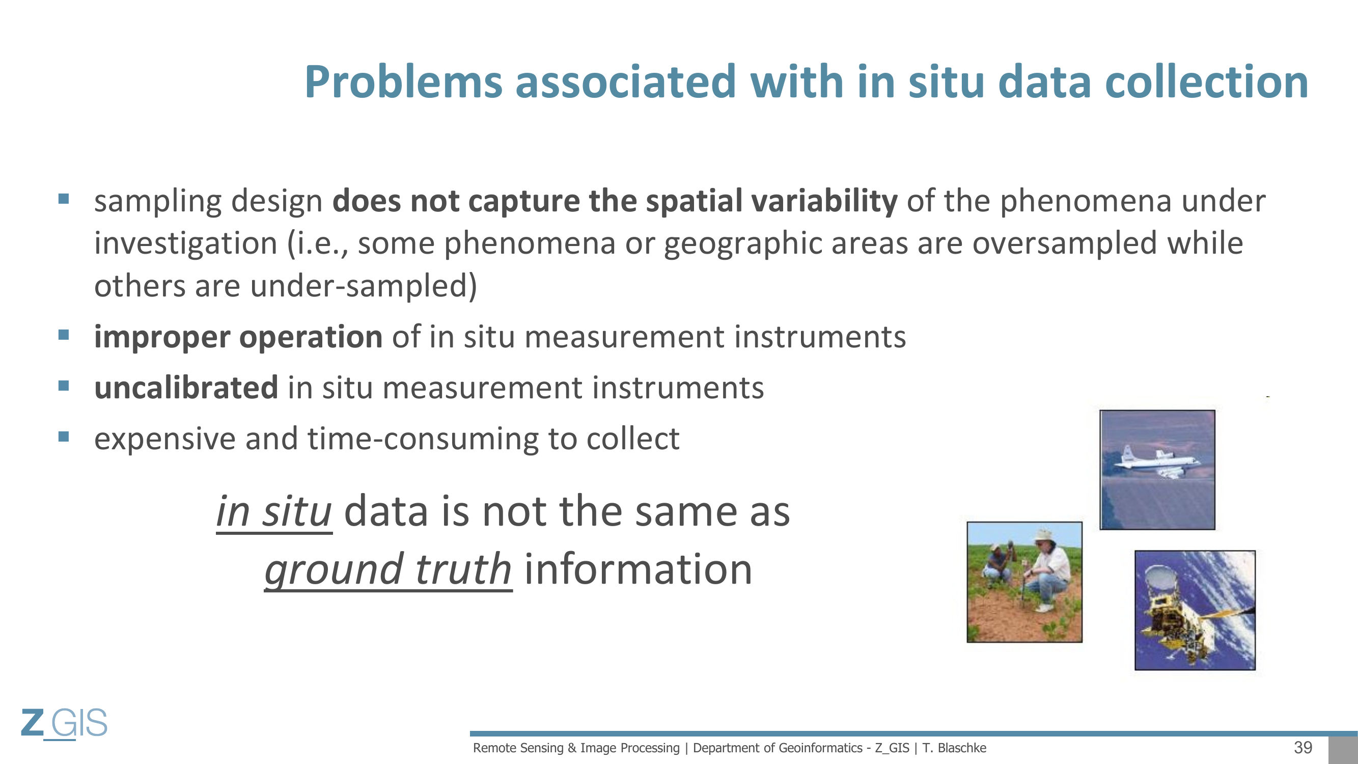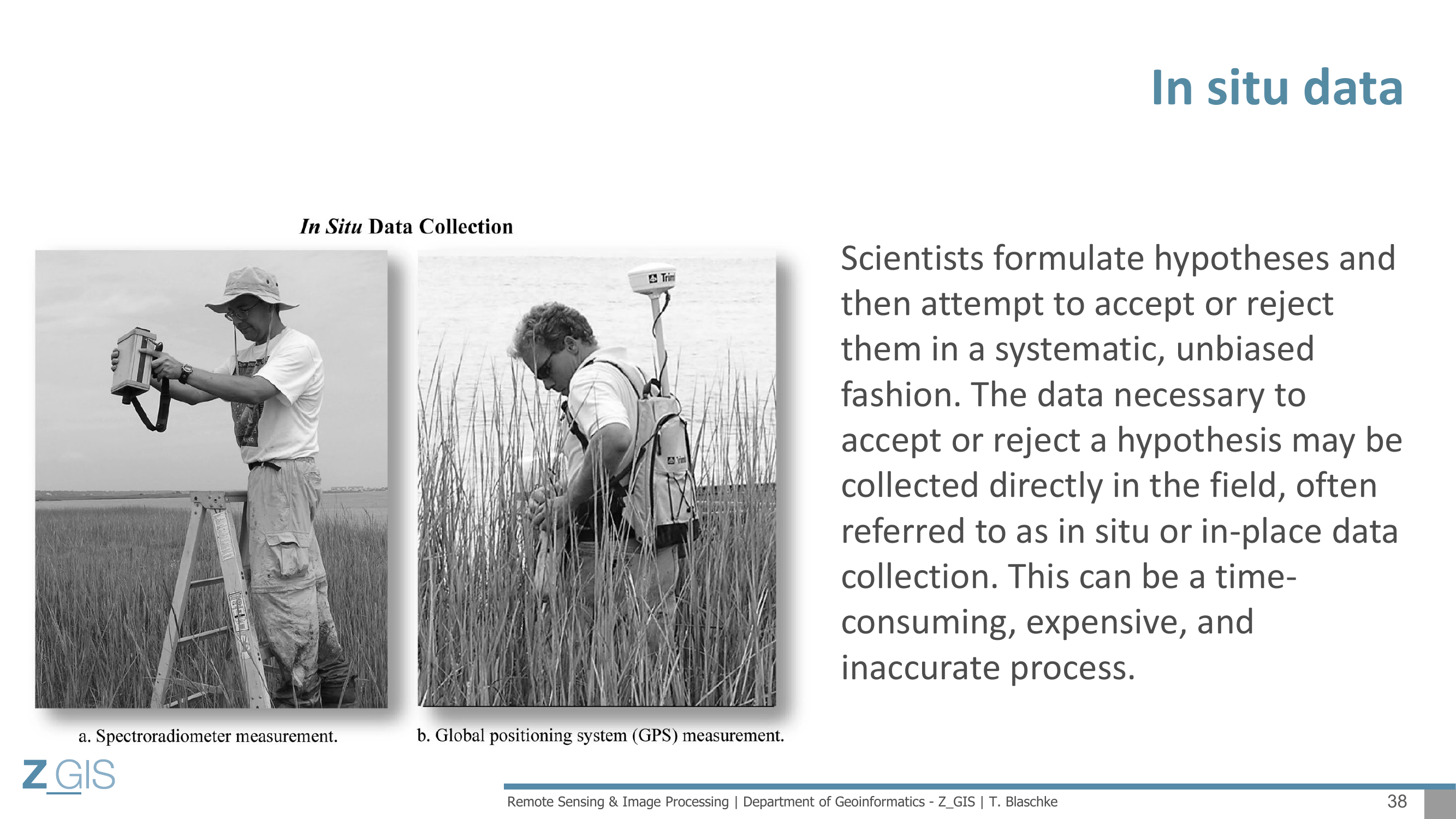 Ein wichtiger Teil des RS-Prozesses, der oft übersehen wird, sind In-situ-Daten (In Situ Data). Slide 38 zeigt zwei typische Beispiele: links eine Spektroradiometer-Messung in einem Schilfgebiet, rechts eine GPS-Messung im Feld. Wissenschaftler formulieren Hypothesen und versuchen, diese systematisch und unvoreingenommen zu bestätigen oder zu widerlegen. Die dafür notwendigen Daten können direkt im Feld erhoben werden - das wird als In-situ- oder In-place-Datenerhebung bezeichnet. Diese Feldarbeit ist jedoch zeitaufwendig, teuer und oft ungenau.