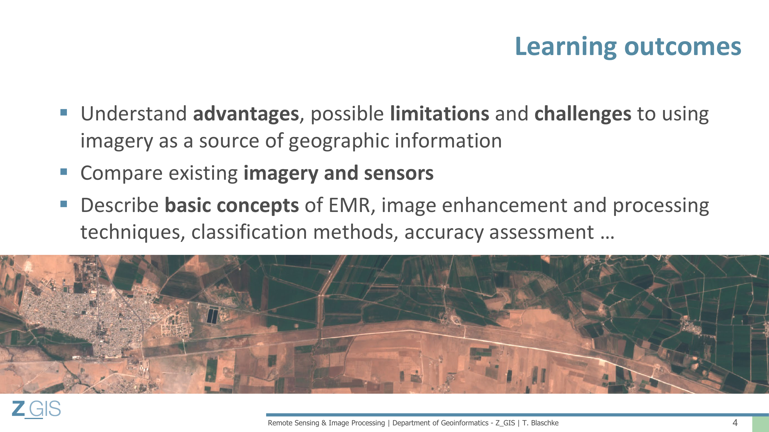 Slide 4 ergänzt die Lernziele: Man soll die Vorteile, möglichen Limitierungen und Herausforderungen verstehen, die mit der Nutzung von Bilddaten als Quelle geographischer Information verbunden sind. Außerdem soll man bestehende Bild- und Sensorsysteme vergleichen und die Grundkonzepte von EMR, Bildverbesserungstechniken, Klassifikationsmethoden und Genauigkeitsbewertung beschreiben können.
