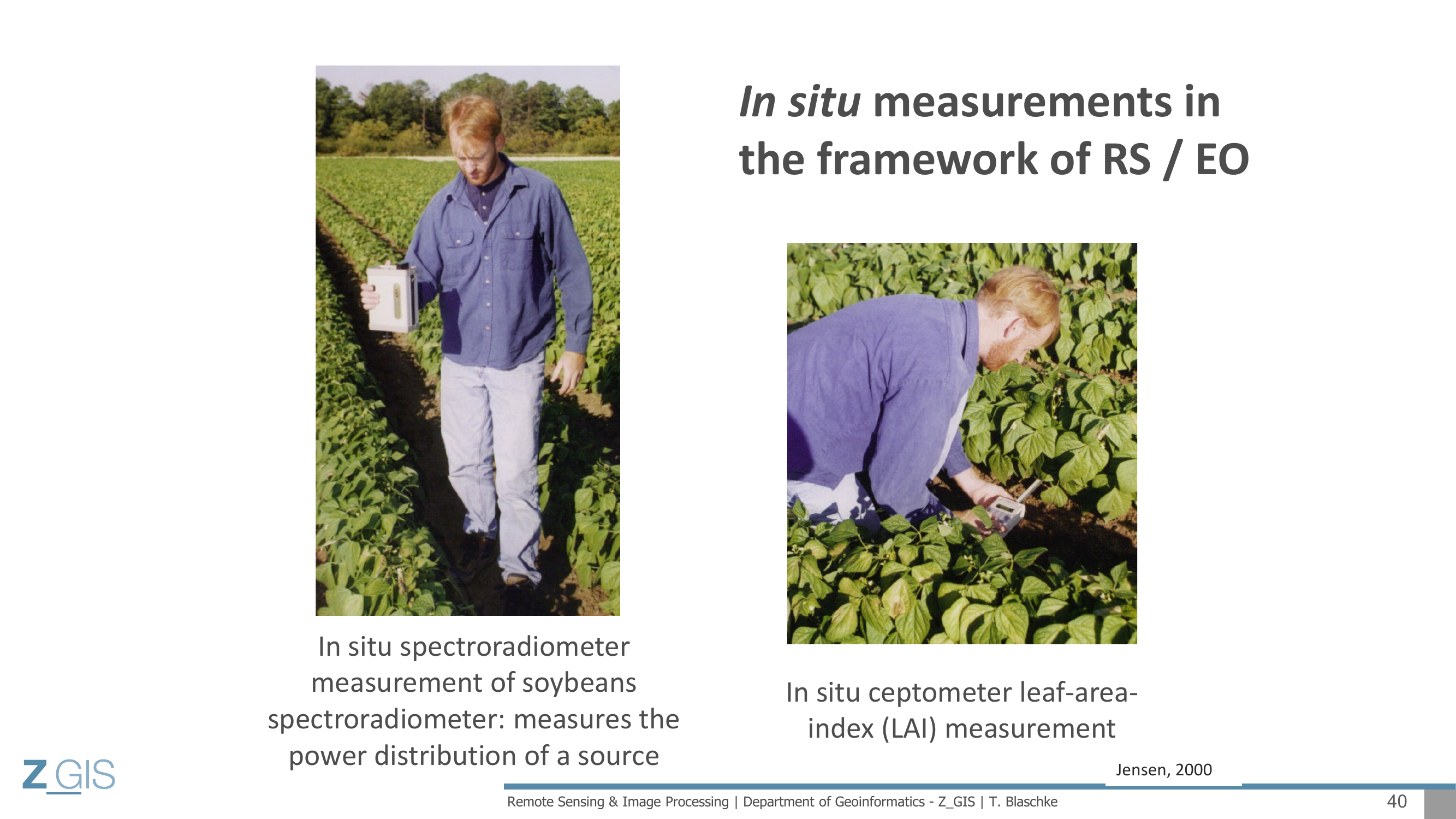 Slide 40 zeigt typische In-situ-Messungen im Kontext von RS/EO: Links eine Spektroradiometer-Messung an Sojabohnen - das Gerät misst die spektrale Leistungsverteilung (Power Distribution) einer Quelle, also wie viel Strahlung bei welcher Wellenlänge reflektiert wird. Rechts eine Ceptometer-Messung des Blattflächenindex (Leaf Area Index, LAI) - ein Maß dafür, wie viel Blattfläche pro Bodenfläche vorhanden ist. Beide Messungen liefern Referenzdaten, die zur Kalibrierung und Validierung von Satellitenbildern genutzt werden können.