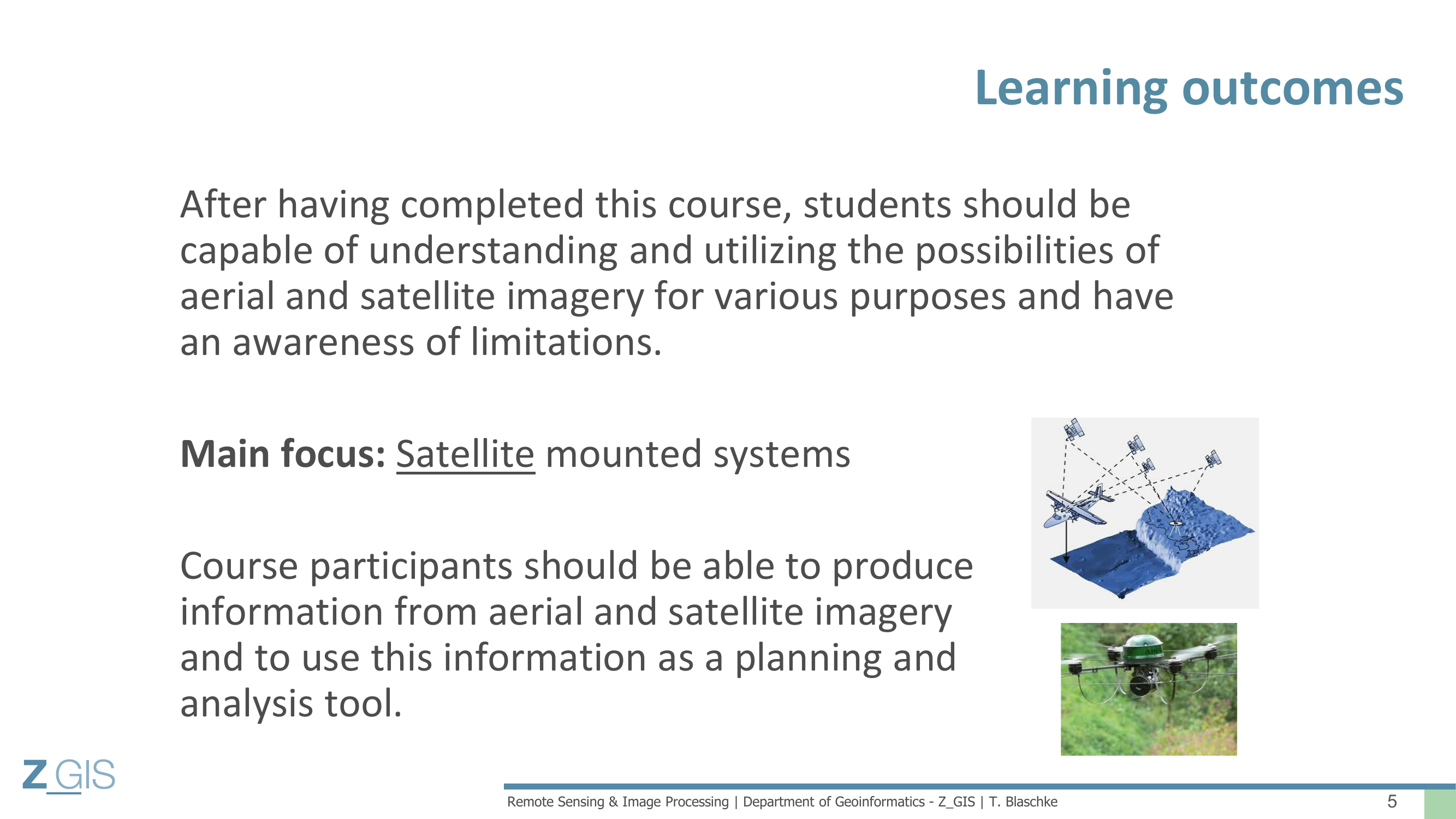 Slide 5 konkretisiert: Nach Abschluss der Lehrveranstaltung sollen Studierende die Möglichkeiten von Luft- und Satellitenbildern für verschiedene Zwecke verstehen und nutzen können, einschließlich eines Bewusstseins für deren Limitierungen. Der Hauptfokus liegt dabei auf satellitengestützten Systemen (Satellite Mounted Systems). Studierende sollen in der Lage sein, Information aus Luft- und Satellitenbildern zu gewinnen und diese als Planungs- und Analysewerkzeug einzusetzen.