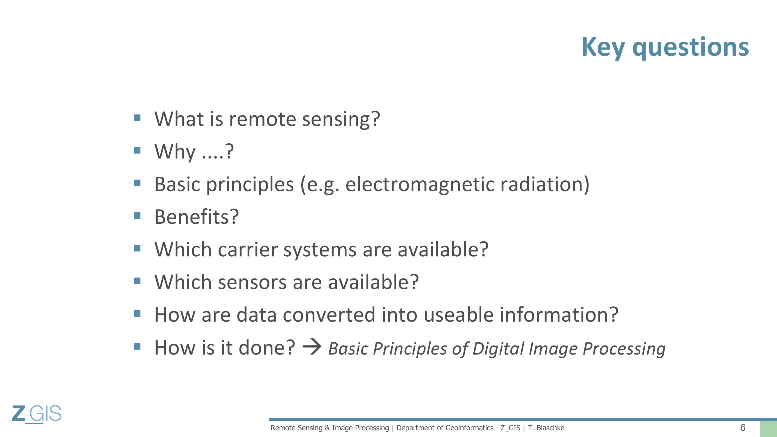 Slide 6 formuliert die zentralen Fragestellungen der gesamten Vorlesung: Was ist Remote Sensing? Warum betreiben wir es? Was sind die physikalischen Grundprinzipien, insbesondere die elektromagnetische Strahlung? Was sind die Vorteile? Welche Trägersysteme (Carrier Systems) und Sensoren gibt es? Wie werden Rohdaten in nutzbare Information umgewandelt? Und wie wird das konkret gemacht - also die Basic Principles of Digital Image Processing?