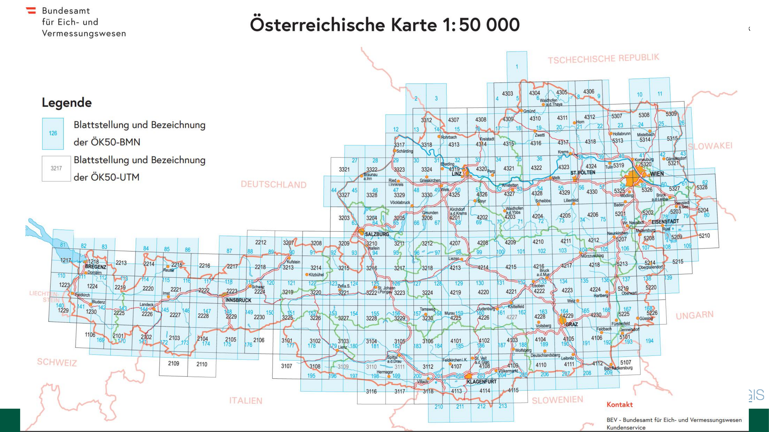 In Österreich ist die ÖK50 (Österreichische Karte 1:50 000) des BEV (Bundesamt für Eich- und Vermessungswesen) das Standardwerk. Ganz Österreich wird in einem systematischen Blattschnitt abgedeckt — jedes Blatt hat eine Nummer (z.B. 3211 für Salzburg). Die ÖK50 gibt es in zwei Varianten: ÖK50-BMN (Bundesmeldenetz) und ÖK50-UTM.