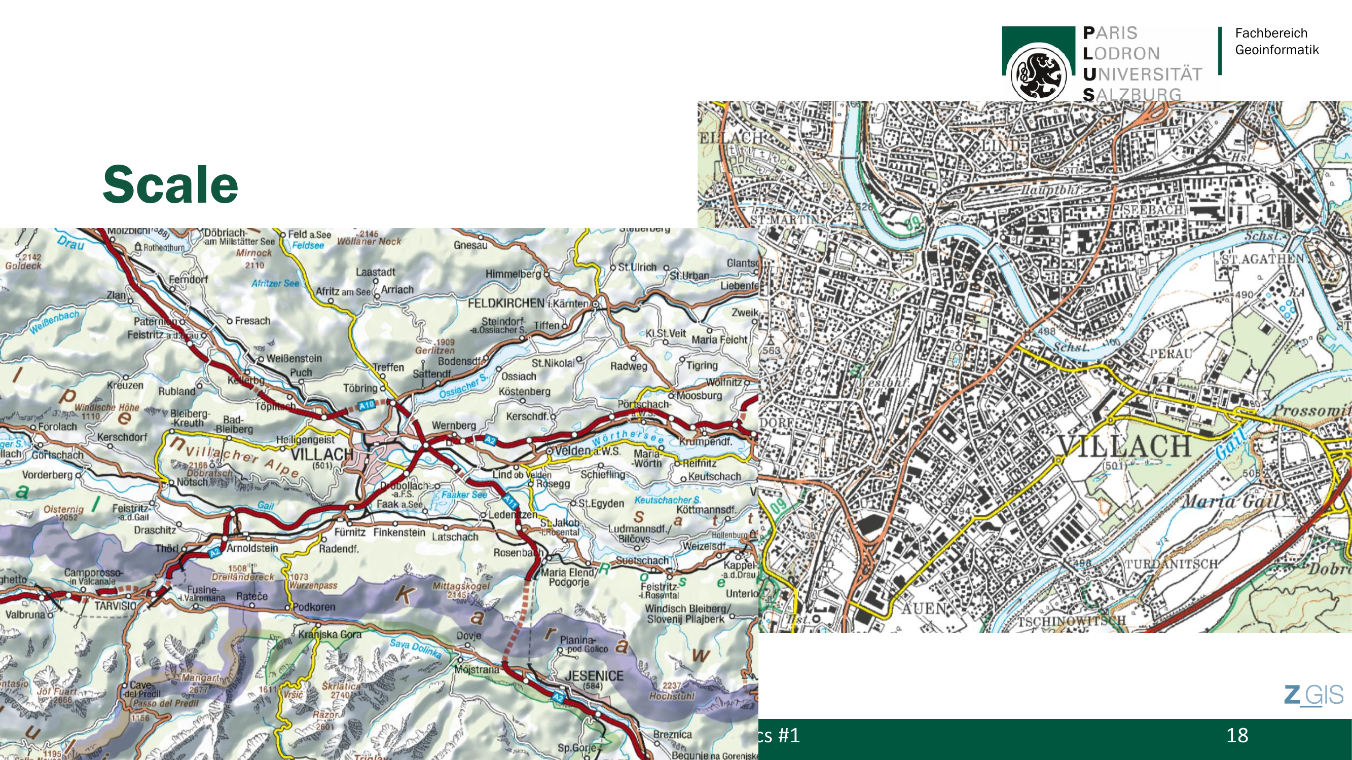 Auf Slide 18 sieht man das direkt: Links die Umgebung von Villach im kleinen Maßstab (viel Gebiet, wenig Detail), rechts Villach im großen Maßstab (wenig Gebiet, viel Detail).