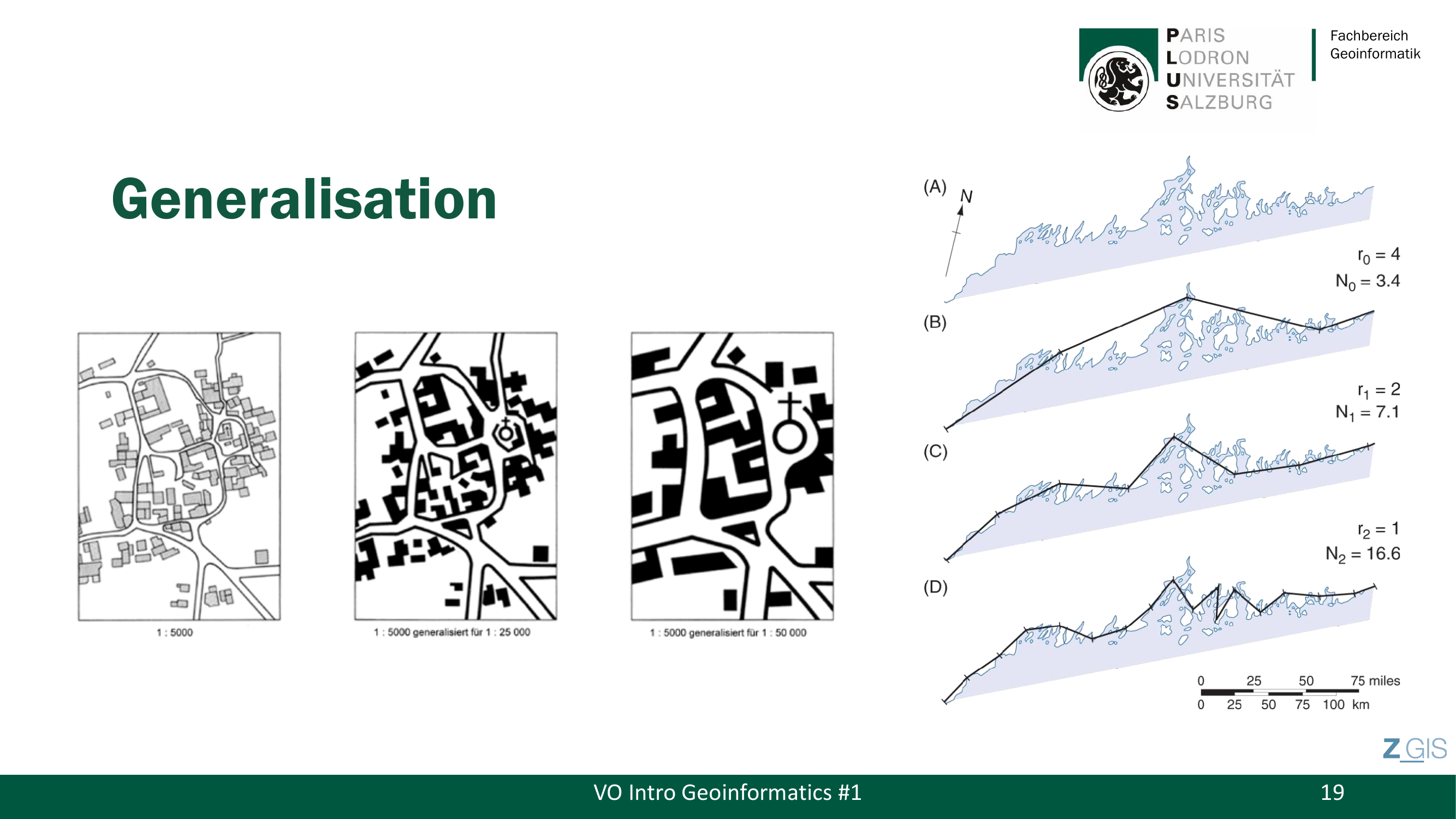 Rechts auf der Slide sieht man das Coastline Paradox (fraktale Dimension): Je feiner man eine Küstenlinie misst (kleinerer Messschritt r), desto länger wird die gemessene Küstenlinie (N steigt), weil immer mehr Buchten und Einbuchtungen erfasst werden. Von r₀ = 4 (N = 3.4) über r₁ = 2 (N = 7.1) bis r₂ = 1 (N = 16.6) — die "wahre" Länge einer Küstenlinie existiert nicht, sie hängt von der Messauflösung ab. Das verdeutlicht, warum Generalisierung unvermeidlich ist.