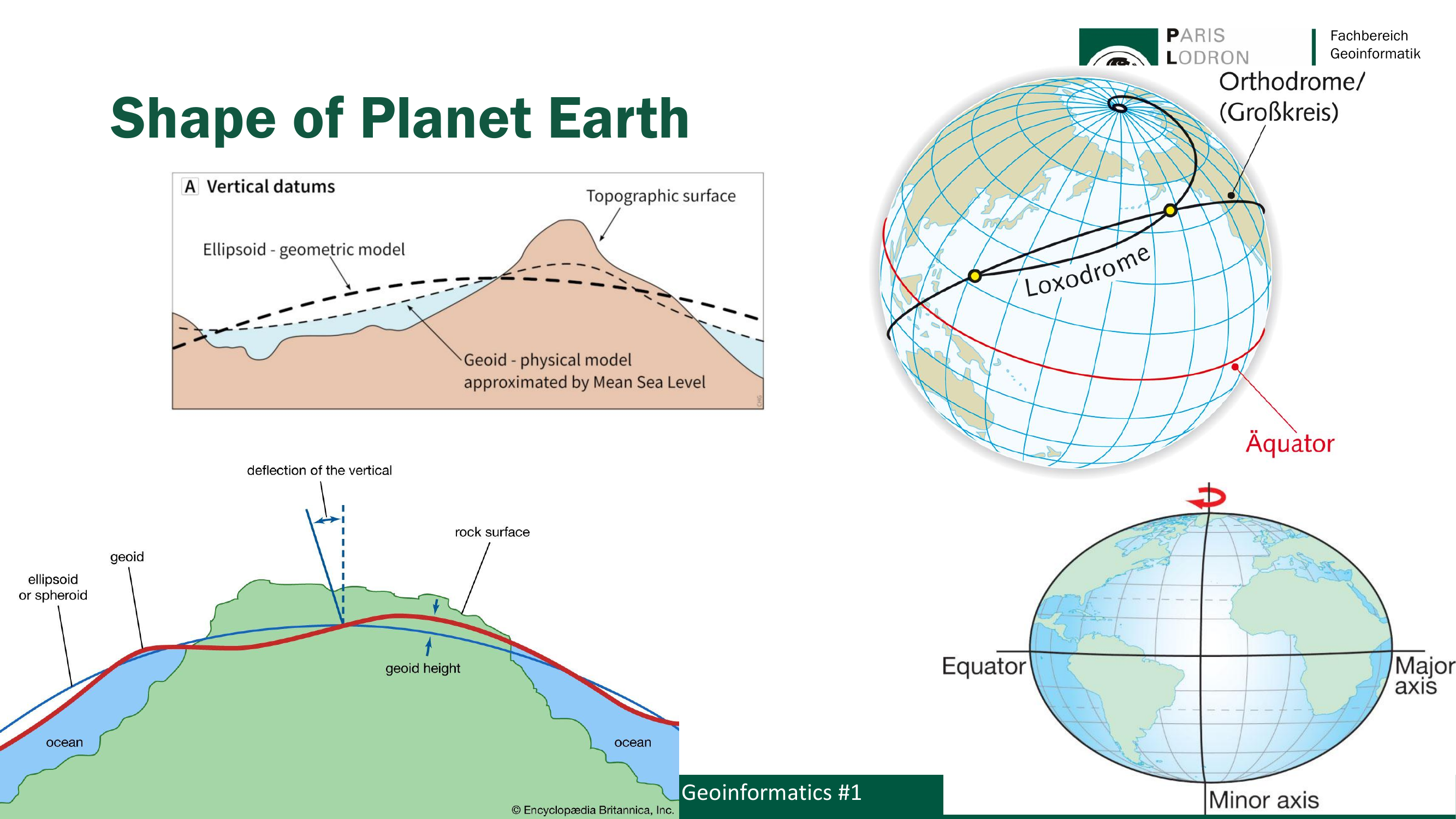 Das Ellipsoid (Spheroid) ist ein mathematisch-geometrisches Modell — definiert durch eine große Halbachse (Major Axis) und eine kleine Halbachse (Minor Axis). Es ist die Referenzfläche für Koordinatensysteme. Zwischen Ellipsoid und Geoid gibt es immer eine Abweichung: die Lotabweichung (Deflection of the Vertical) und die Geoidhöhe (Geoid Height).