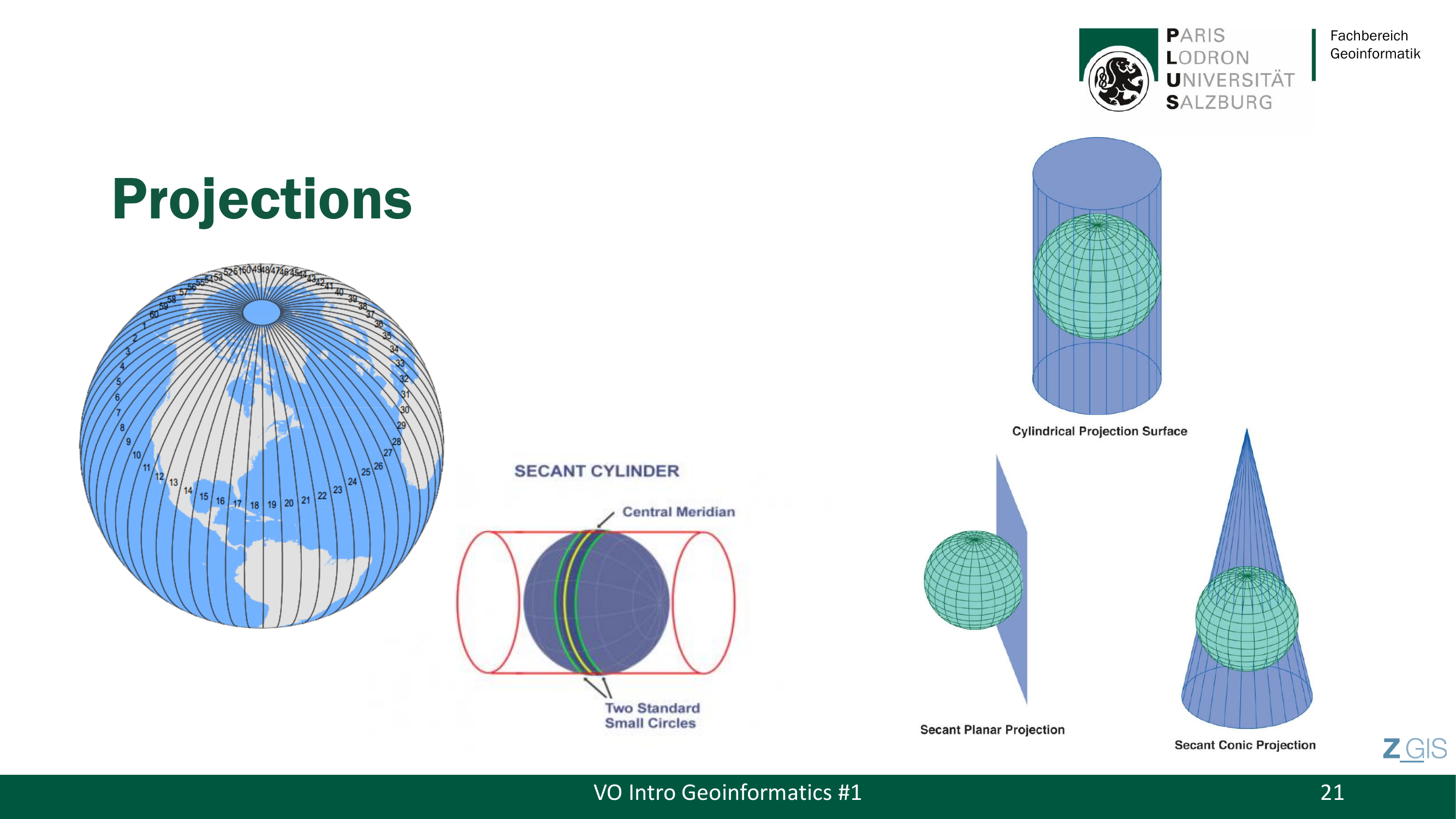 Auf Slide 23 links sieht man den Secant Cylinder: Exakter Maßstab herrscht entlang der zwei Schnittlinien (Lines of Exact Scale, Punkte B und E). Dazwischen ist der Maßstab leicht verkleinert, außerhalb leicht vergrößert. Die UTM-Zonen werden mit Buchstaben in Breitenbänder unterteilt — Mitteleuropa liegt in 32U und 33U.