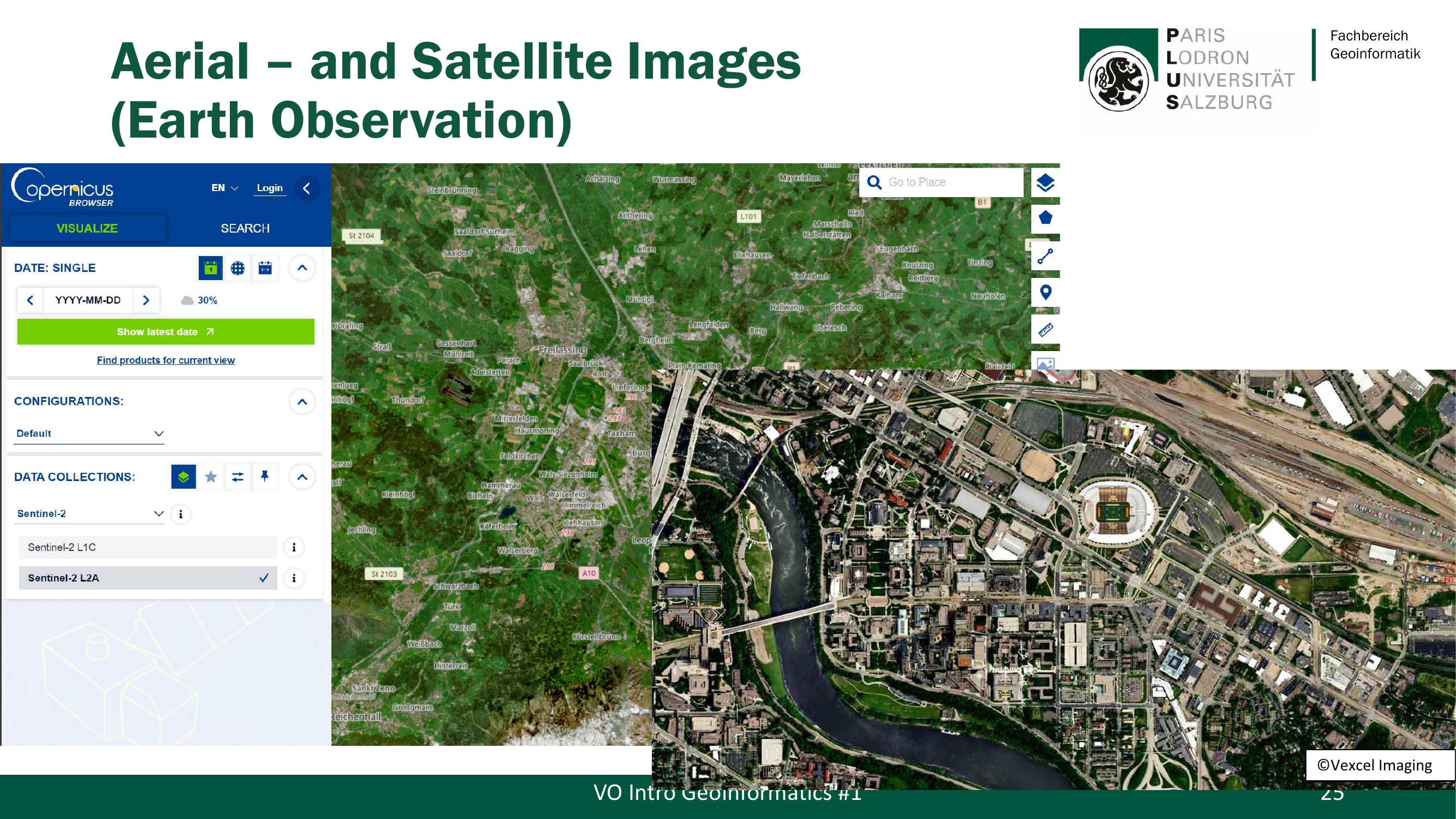 Erdbeobachtung (Earth Observation) ist eine zentrale Primärdatenquelle für GIS. Slide 25 zeigt den Copernicus Browser — das europäische Erdbeobachtungsprogramm mit den Sentinel-Satelliten. Sentinel-2 liefert frei zugängliche, großflächige Satellitenbilder (z.B. Sentinel-2 L2A). Man kann Salzburg aus dem All betrachten, mit verschiedenen Spektralband-Kombinationen.