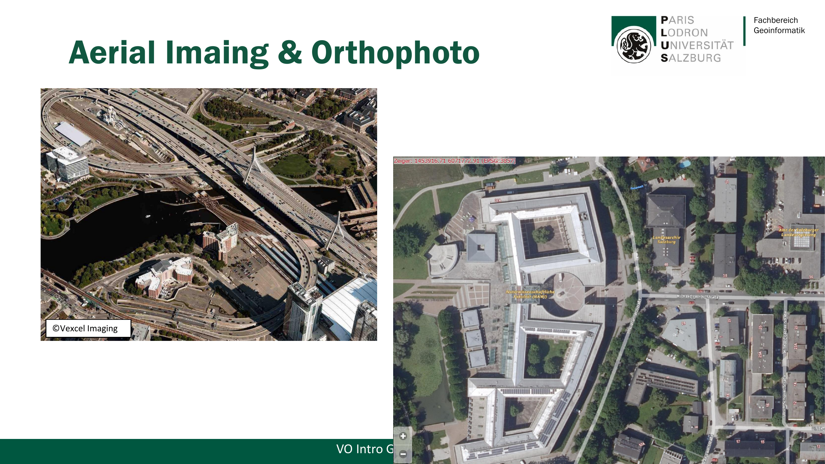 Ein Luftbild (Aerial Image) ist eine fotografische Aufnahme aus der Luft, oft als Schrägaufnahme. Links auf Slide 26 sieht man ein Beispiel von Vexcel Imaging: perspektivische Verzerrungen, Gebäude kippen zum Bildrand hin, der Maßstab variiert über das Bild. Man kann es nicht direkt als Karte verwenden.