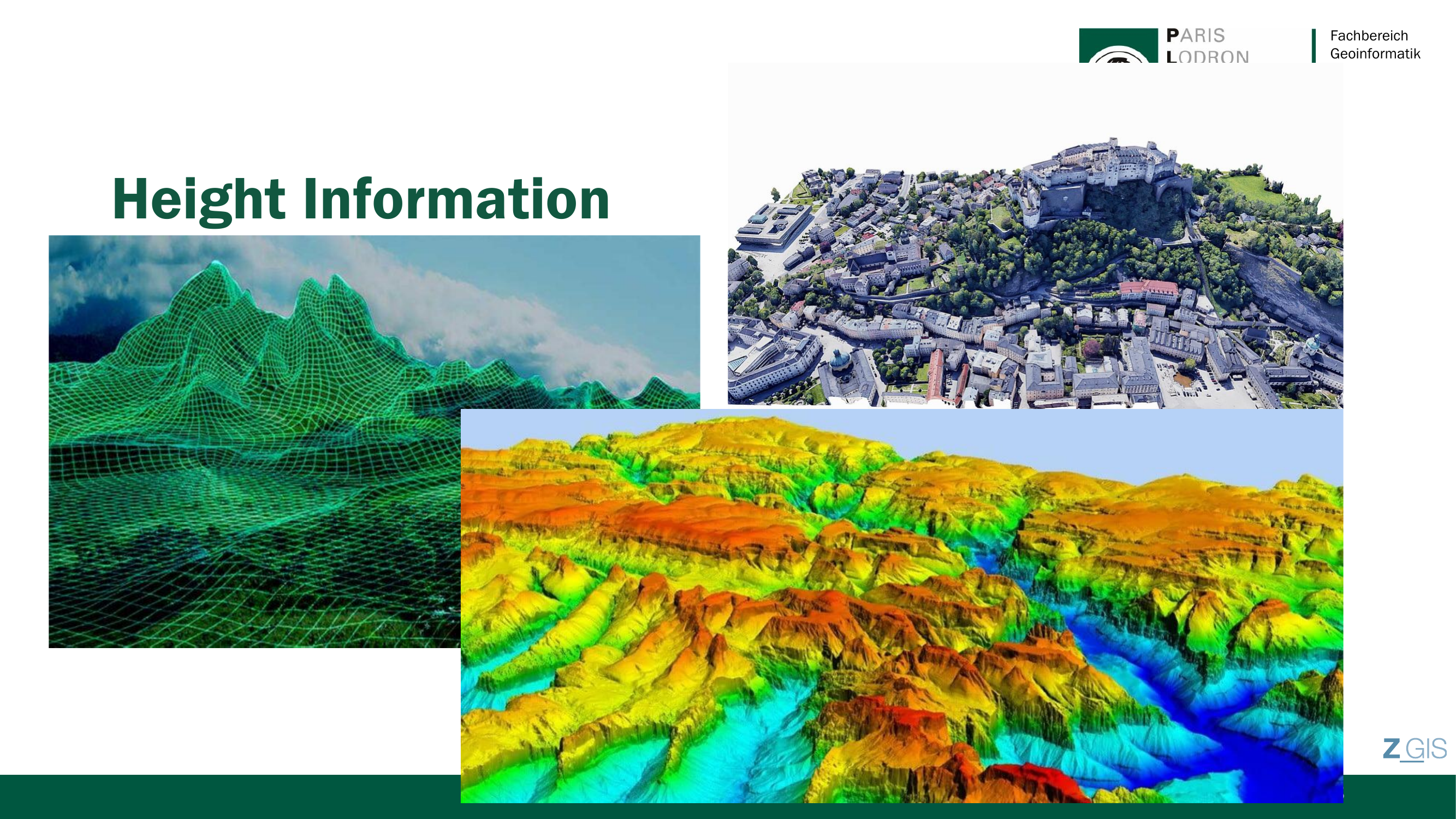 Ein Digitales Geländemodell (DGM, englisch DEM = Digital Elevation Model) ist eine digitale Repräsentation der Geländeoberfläche als Höhenwerte. Slide 28 zeigt drei Darstellungsformen: