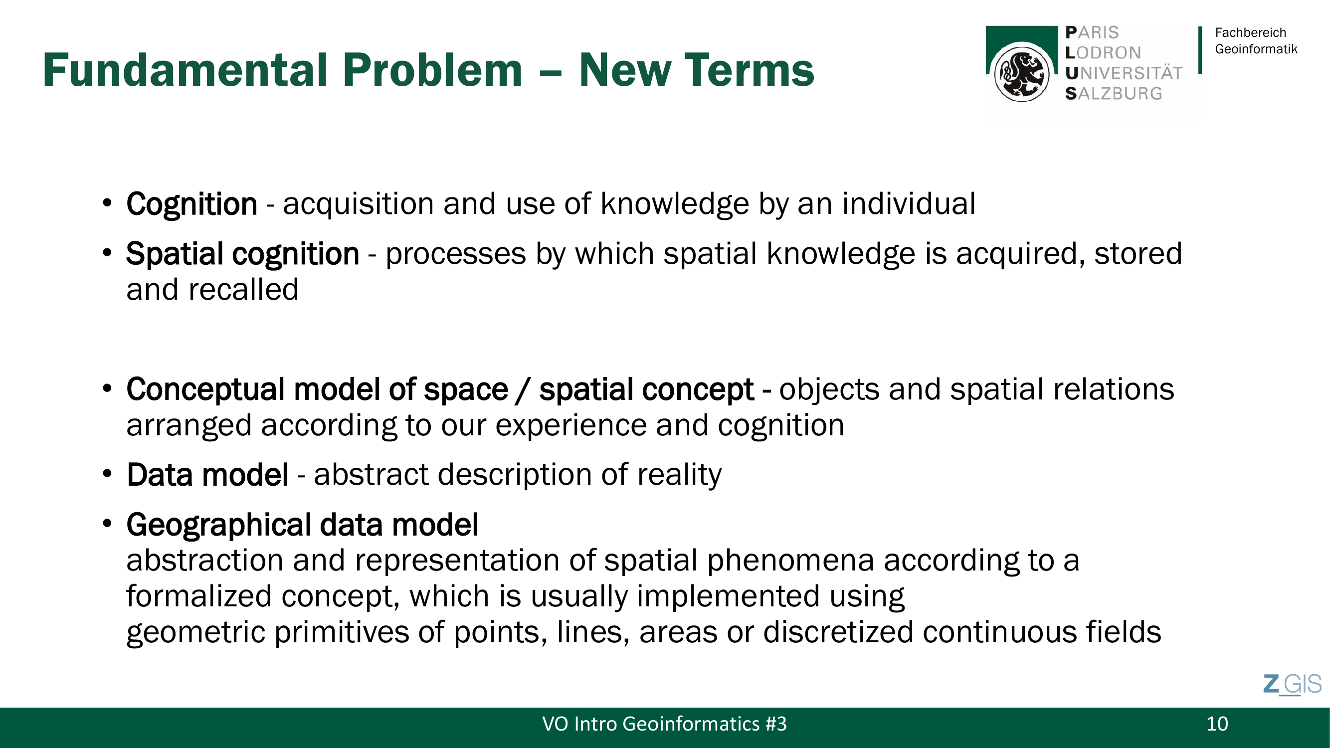 In diesem Zusammenhang fuehrt die Vorlesung mehrere zentrale Begriffe ein. Cognition bezeichnet die Faehigkeit, Wissen zu erwerben und zu nutzen. Spatial Cognition (räumliche Kognition) beschreibt die Prozesse, durch die raeumliches Wissen erworben, gespeichert und abgerufen wird. Ein Conceptual Model of Space (konzeptuelles Raummodell) ordnet Objekte und raeumliche Beziehungen nach Erfahrung und Kognition an. Ein Data Model (Datenmodell) ist eine abstrakte Beschreibung der Realitaet. Das Geographical Data Model (geographisches Datenmodell) schliesslich ist die Abstraktion und Repräsentation raeumlicher Phaenomene nach einem formalisierten Konzept, das typischerweise mit geometrischen Primitiven (Punkte, Linien, Flaechen) oder diskretisierten kontinuierlichen Feldern umgesetzt wird.