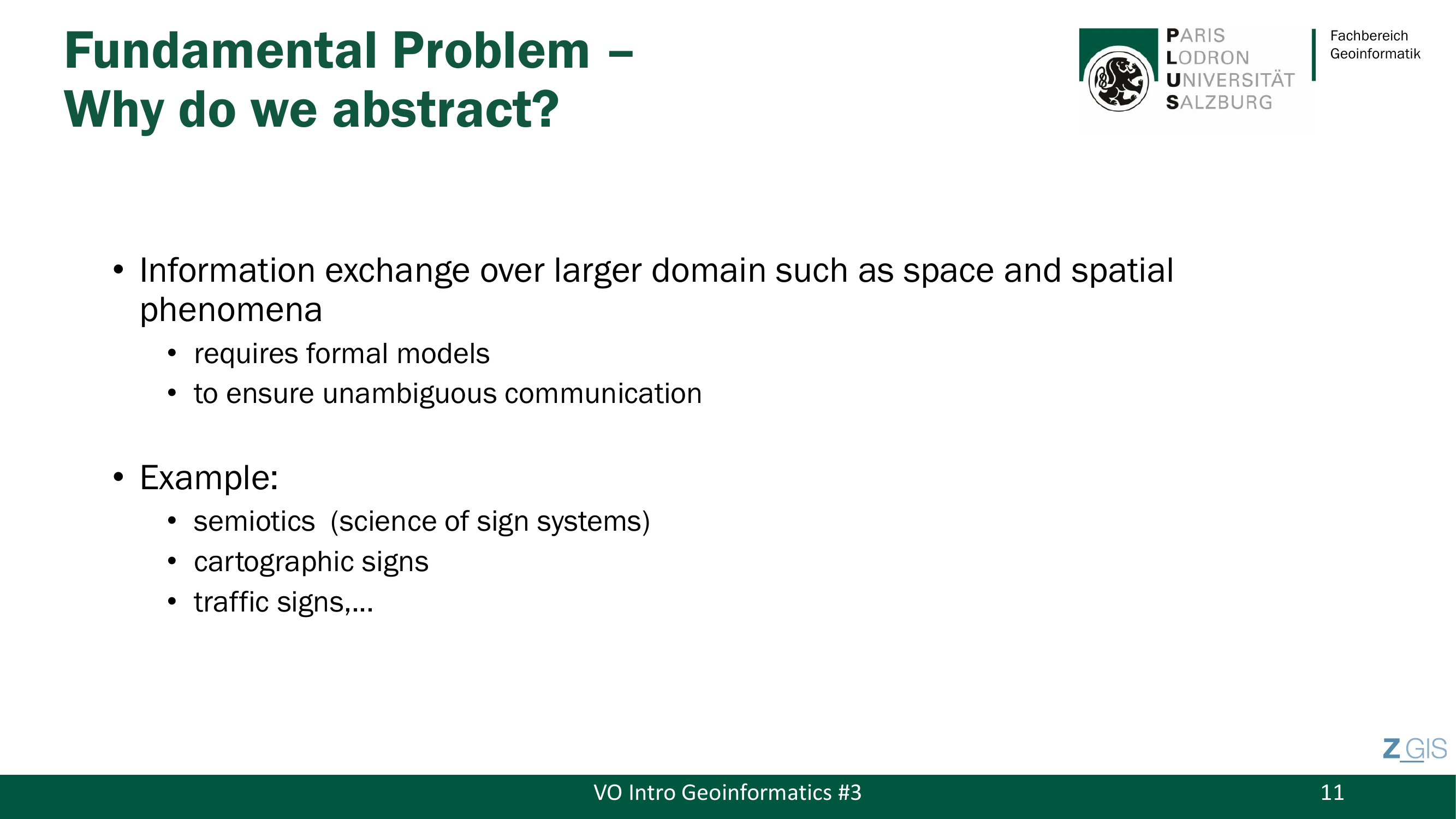 Warum abstrahieren wir ueberhaupt? Weil der Informationsaustausch ueber groessere Domaenen wie Raum und raeumliche Phaenomene formale Modelle erfordert, um eindeutige Kommunikation sicherzustellen. Slide 11 erwaehnt als Beispiel die Semiotik (Semiotics), also die Wissenschaft der Zeichensysteme, wie etwa kartographische Zeichen oder Verkehrszeichen. Der Prof hat dieses Thema jedoch explizit ausgeklammert: "No need to know about semiotics."