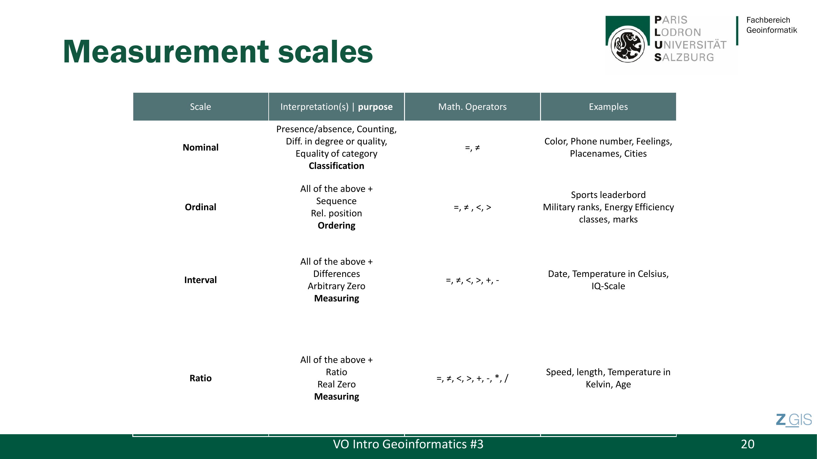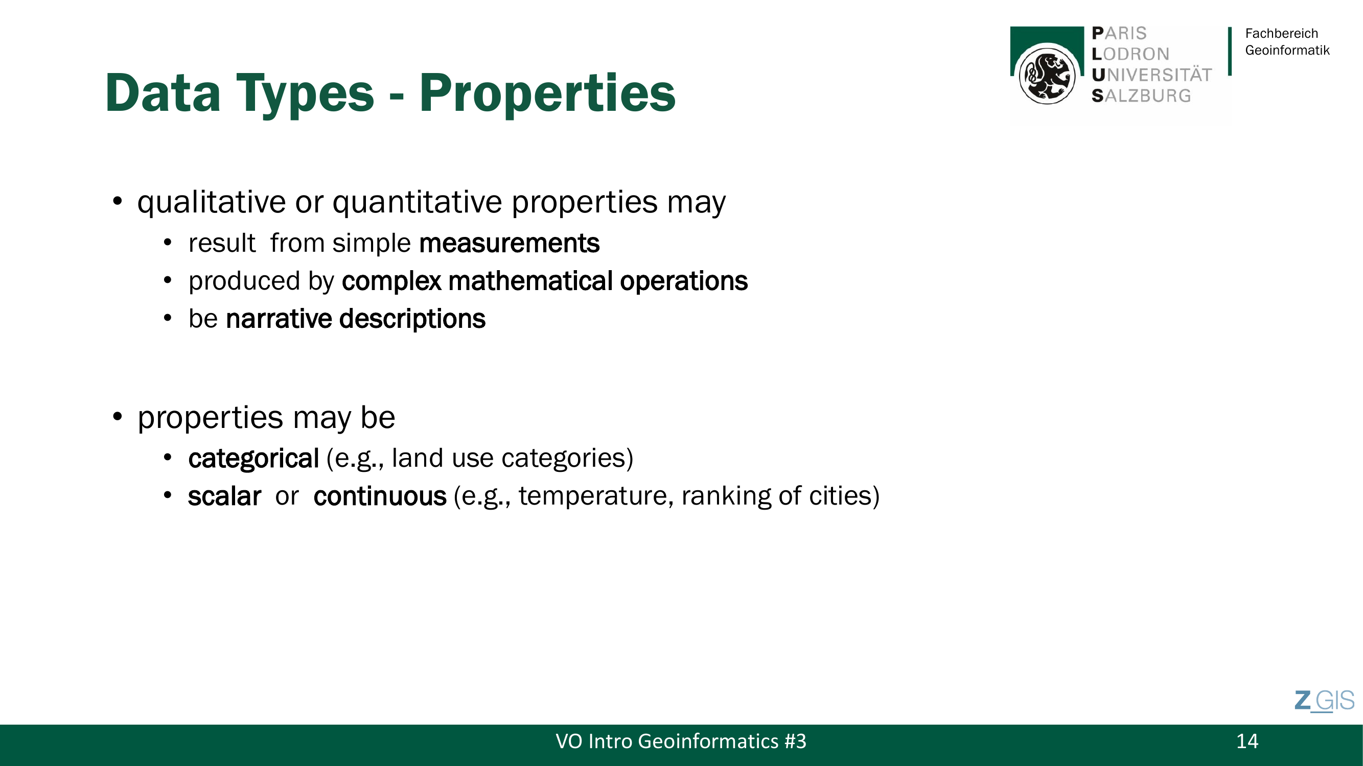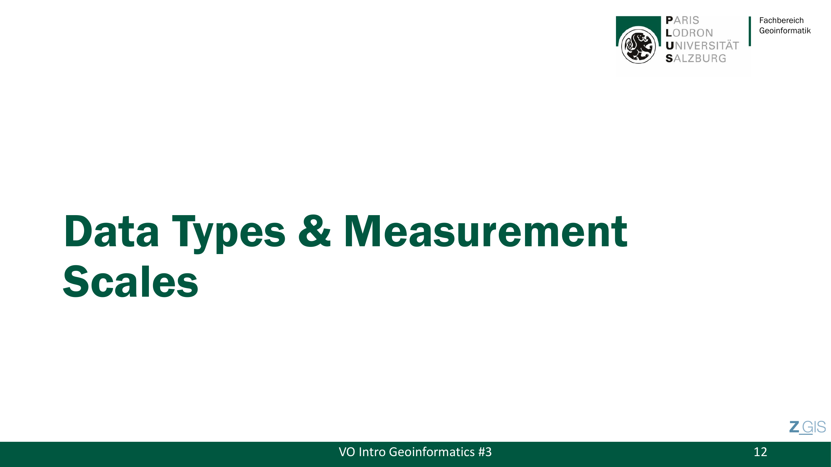 Bevor man geographische Daten modellieren kann, muss man verstehen, welche Arten von Daten es ueberhaupt gibt und was man mit ihnen tun darf. Die grundlegende Unterscheidung ist die zwischen qualitativen Daten (Qualitative Data) und quantitativen Daten (Quantitative Data). Qualitative Daten sind attributiv und deskriptiv -- sie beschreiben Eigenschaften ohne numerischen Wert, etwa Landnutzungskategorien wie Wald, Wiese oder Siedlung. Quantitative Daten hingegen sind numerisch und druecken messbare Groessen als Zahlen aus, etwa Temperatur, Hoehe oder Geschwindigkeit.