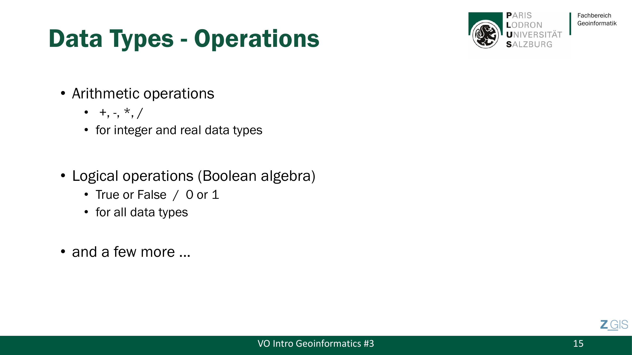 Entscheidend ist: Fuer unterschiedliche Datentypen gelten unterschiedliche Operationen. Arithmetische Operationen (+, -, , /) sind nur fuer Integer- und Realzahltypen zulaessig. Logische Operationen* (Boolesche Algebra: True/False, 0/1) gelten hingegen fuer alle Datentypen. Wer Autobahnnummern miteinander multipliziert, erhaelt sinnlose Ergebnisse -- und genau deshalb ist die korrekte Zuordnung von Datentypen und Operationen fundamental.