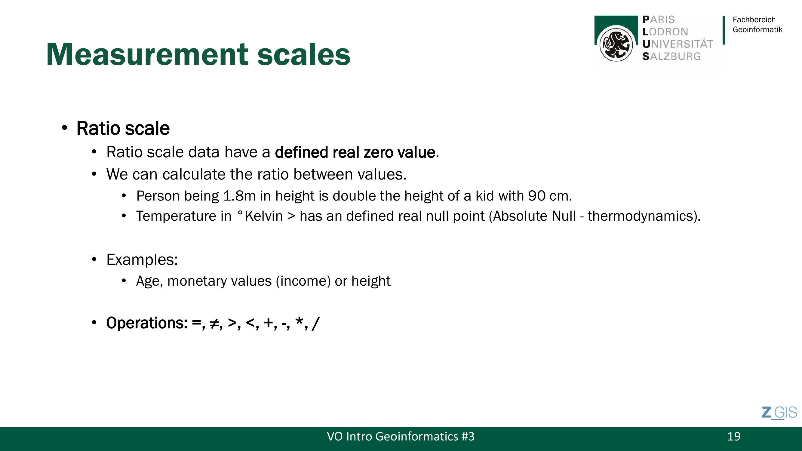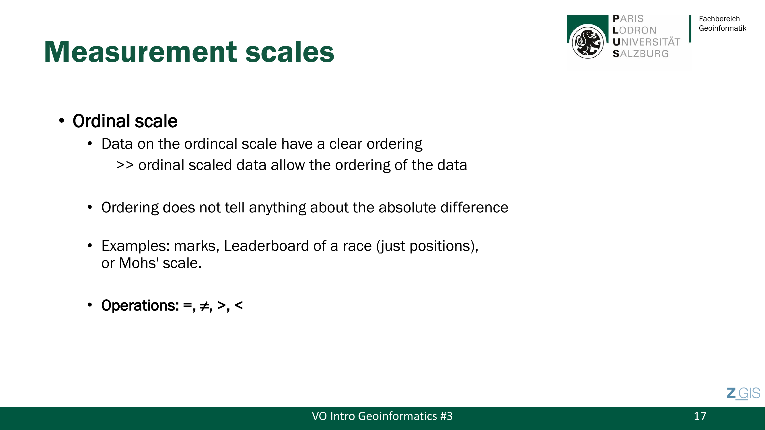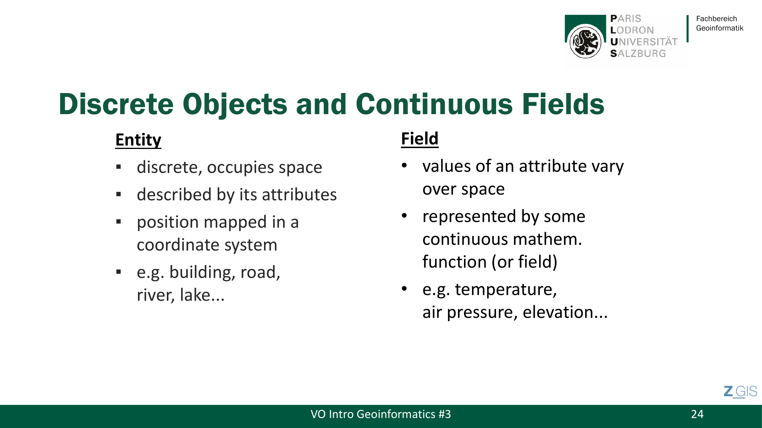 Diese Lecture ist die prüfungsrelevanteste im gesamten Kurs: Drei der behandelten Themenblöcke (Messskalen, Entities & Fields, Vektor & Raster) sind als direkte Altfragen in den Prüfungsterminen Juli 2024 und 2025 aufgetaucht. Der Prof bezeichnete diese Session selbst als "the most important part" und eines der "core topics" der gesamten Lehrveranstaltung.