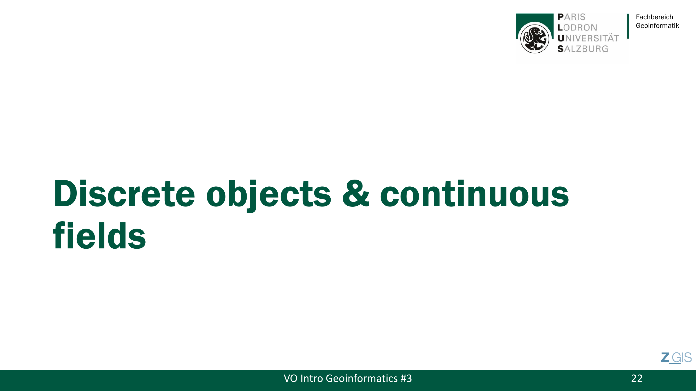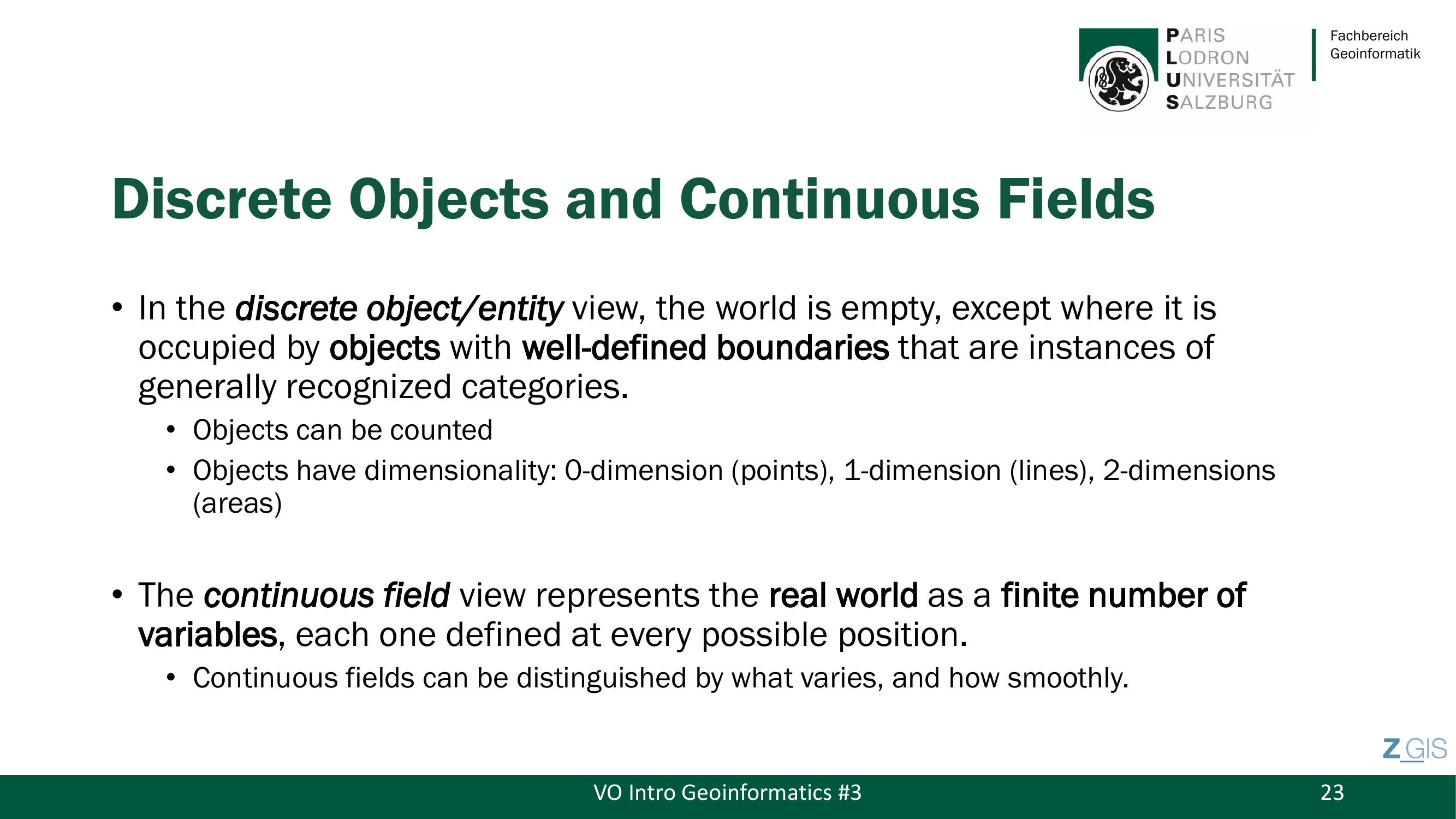 Nachdem klar ist, welche Arten von Daten es gibt, stellt sich die naechste Frage: Wie betrachten wir die reale Welt ueberhaupt, bevor wir sie in Daten uebersetzen? Die Geoinformatik kennt dafuer genau zwei fundamentale konzeptuelle Sichtweisen, und es ist wichtig zu verstehen, dass es sich dabei um Denkmodelle handelt -- nicht um technische Implementierungen.