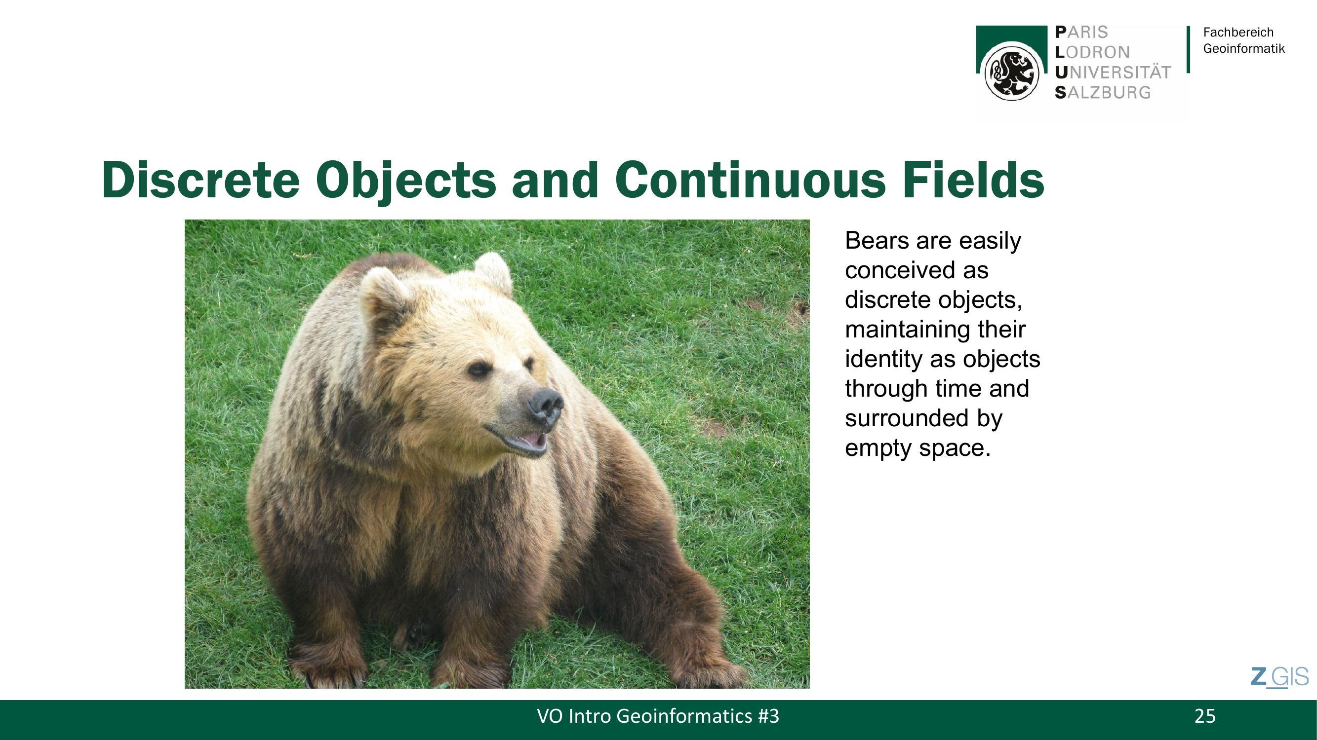 Ein anschauliches Beispiel fuer die Entity View ist ein Baer: Er ist leicht als diskretes Objekt zu konzeptualisieren, denn er behaelt seine Identitaet ueber die Zeit und ist von leerem Raum umgeben. Weitere Beispiele sind Gebaeude, Strassen, Fluesse, Seen und Grundstuecke.