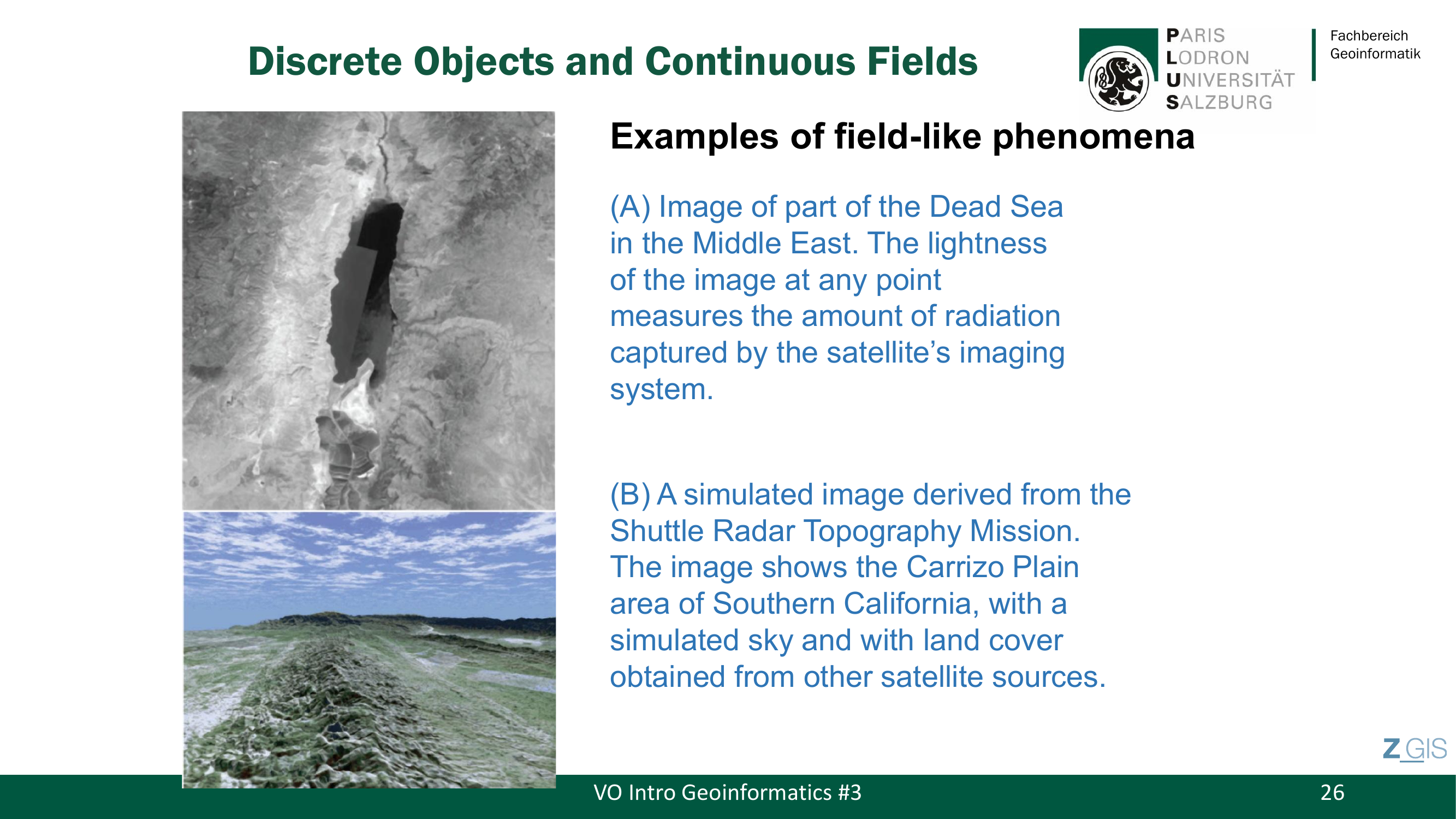Beispiele fuer die Field View sind Satellitenbilder (die Helligkeit an jedem Punkt misst die eingefangene Strahlung), digitale Hoehenmodelle (Elevation/DEM) wie das simulierte Bild der Carrizo Plain in Suedkalifornien, sowie Temperatur, Luftdruck und Niederschlag. Bei all diesen Phaenomenen ist der Attributwert an jedem Punkt im Raum definiert und variiert kontinuierlich.
