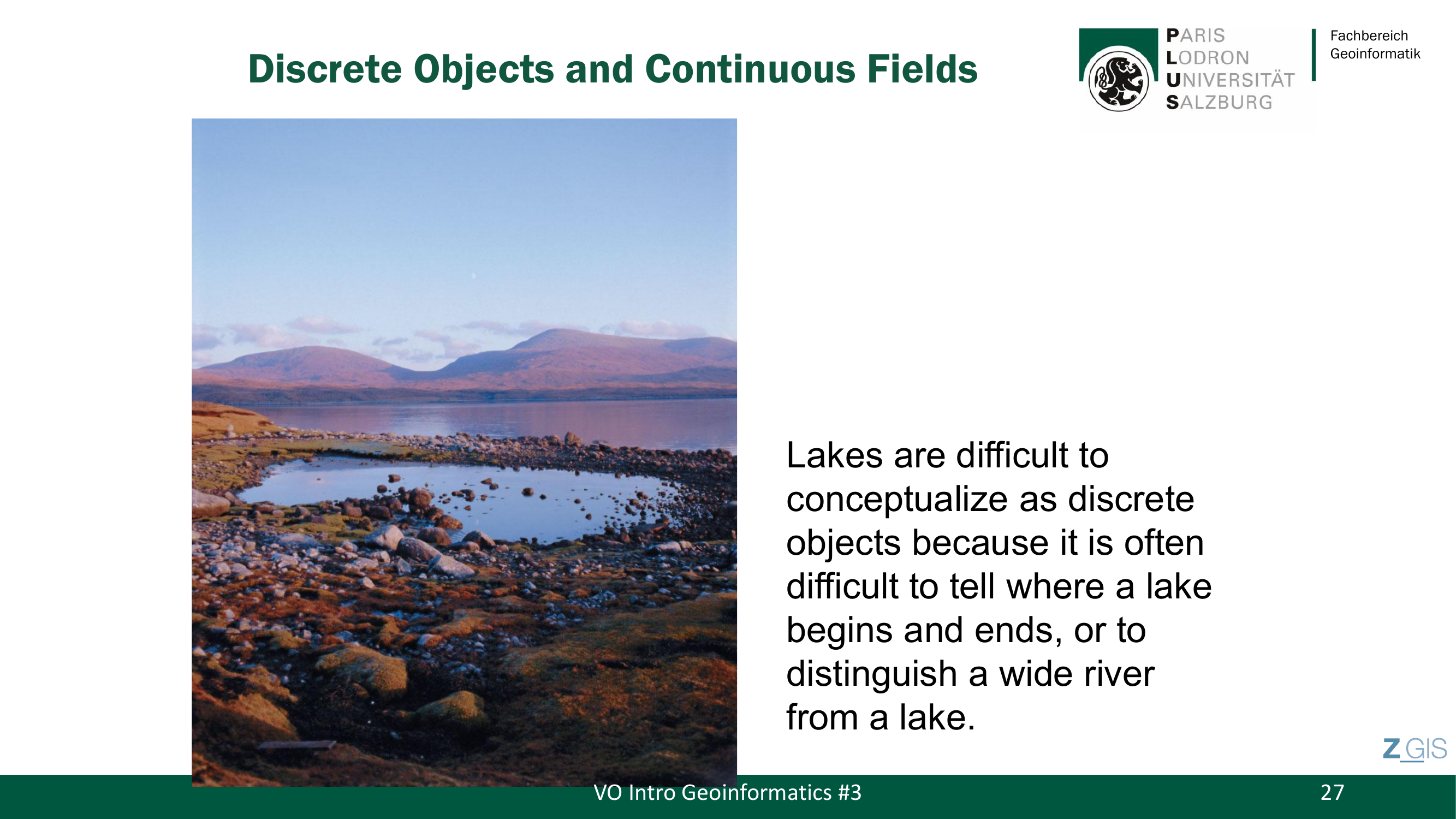 Es gibt allerdings auch Grenzfaelle (Borderline Cases), die die Grenzen beider Sichtweisen aufzeigen. Seen sind ein klassisches Beispiel: Sie sind schwer als diskrete Objekte zu konzeptualisieren, weil ihre Grenzen oft unklar sind. Wo genau beginnt und endet ein See? Wie unterscheidet man einen breiten Fluss von einem See? Diese Ambiguitaet zeigt, dass die Wahl der konzeptuellen Sichtweise immer eine Modellierungsentscheidung ist, die vom Untersuchungszweck abhaengt.