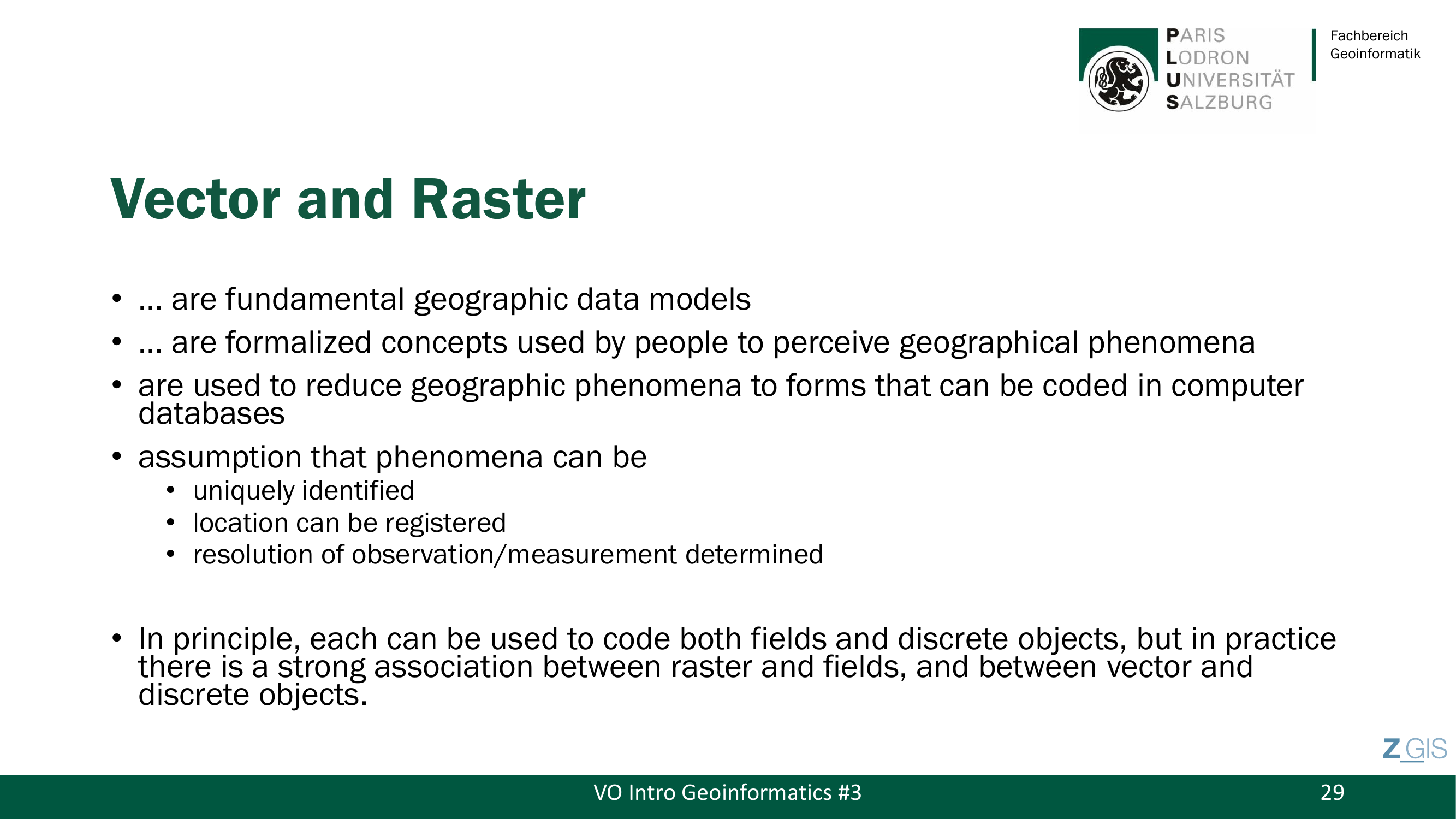 Beide Modelle sind formalisierte Konzepte, die geographische Phaenomene in Formen uebersetzen, die in Computerdatenbanken kodierbar sind. Die Grundannahmen beider Modelle sind, dass Phaenomene eindeutig identifiziert, ihre Position registriert und die Aufloesung der Beobachtung bestimmt werden koennen. In der Praxis besteht eine starke Assoziation: Raster wird typischerweise fuer Fields (kontinuierliche Felder) verwendet, Vektor fuer Entities (diskrete Objekte). Grundsaetzlich kann aber jedes Modell beide konzeptuellen Sichten abbilden.