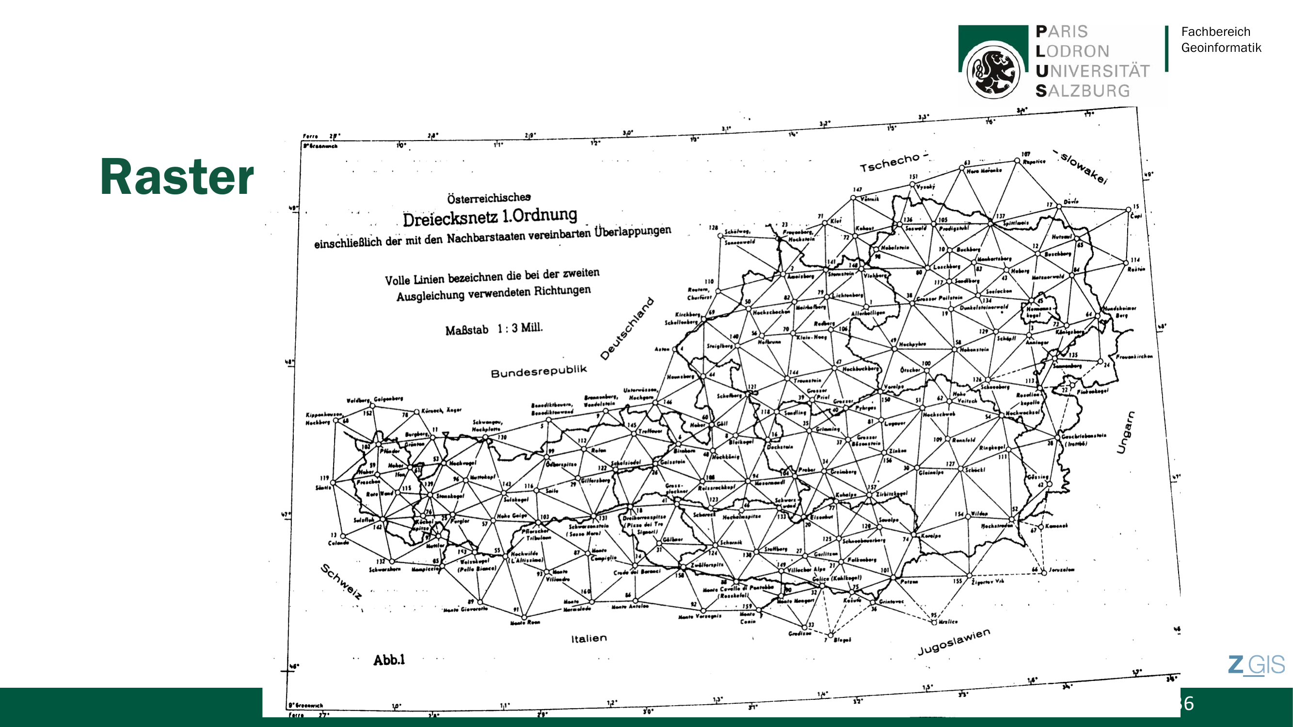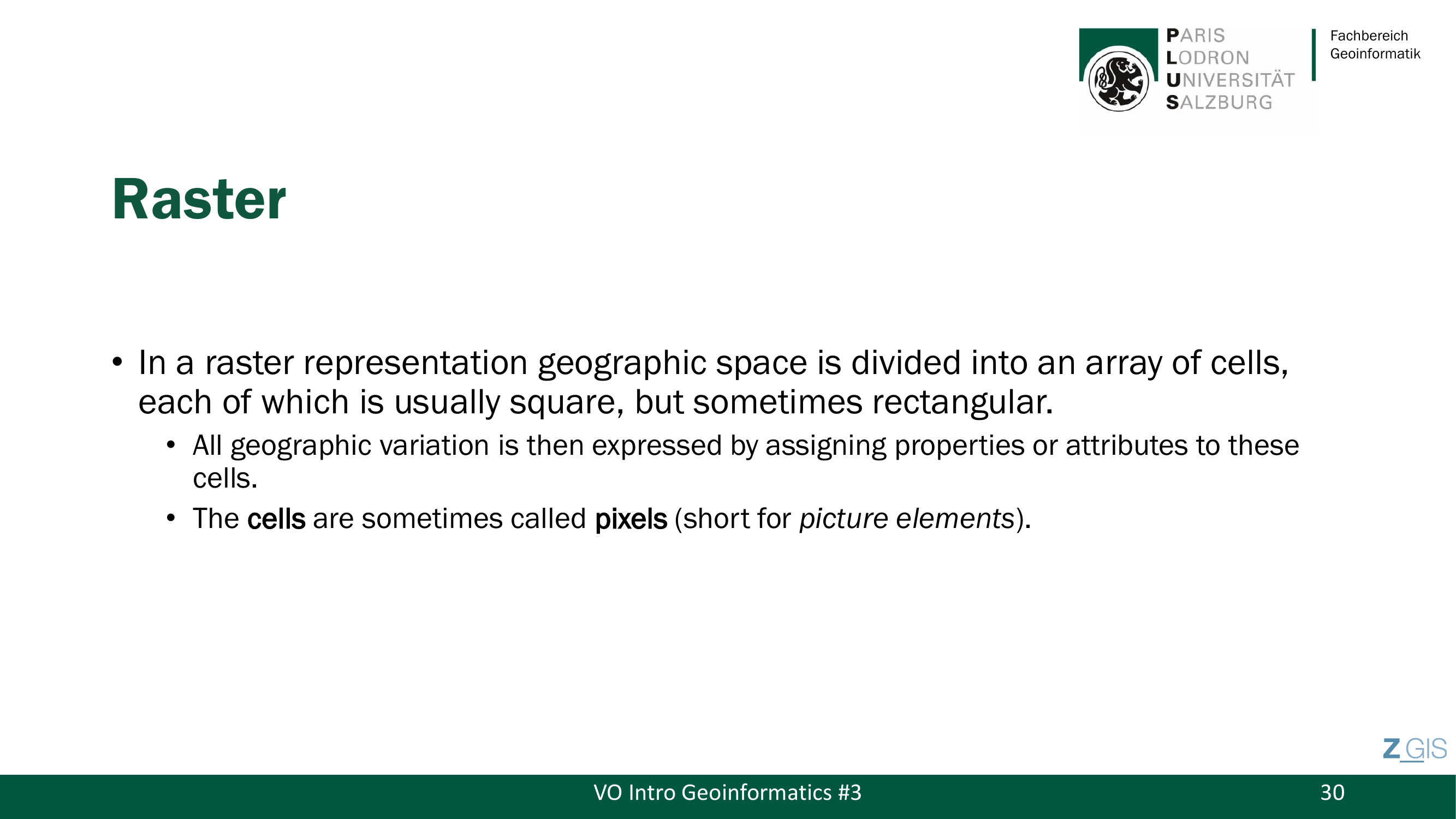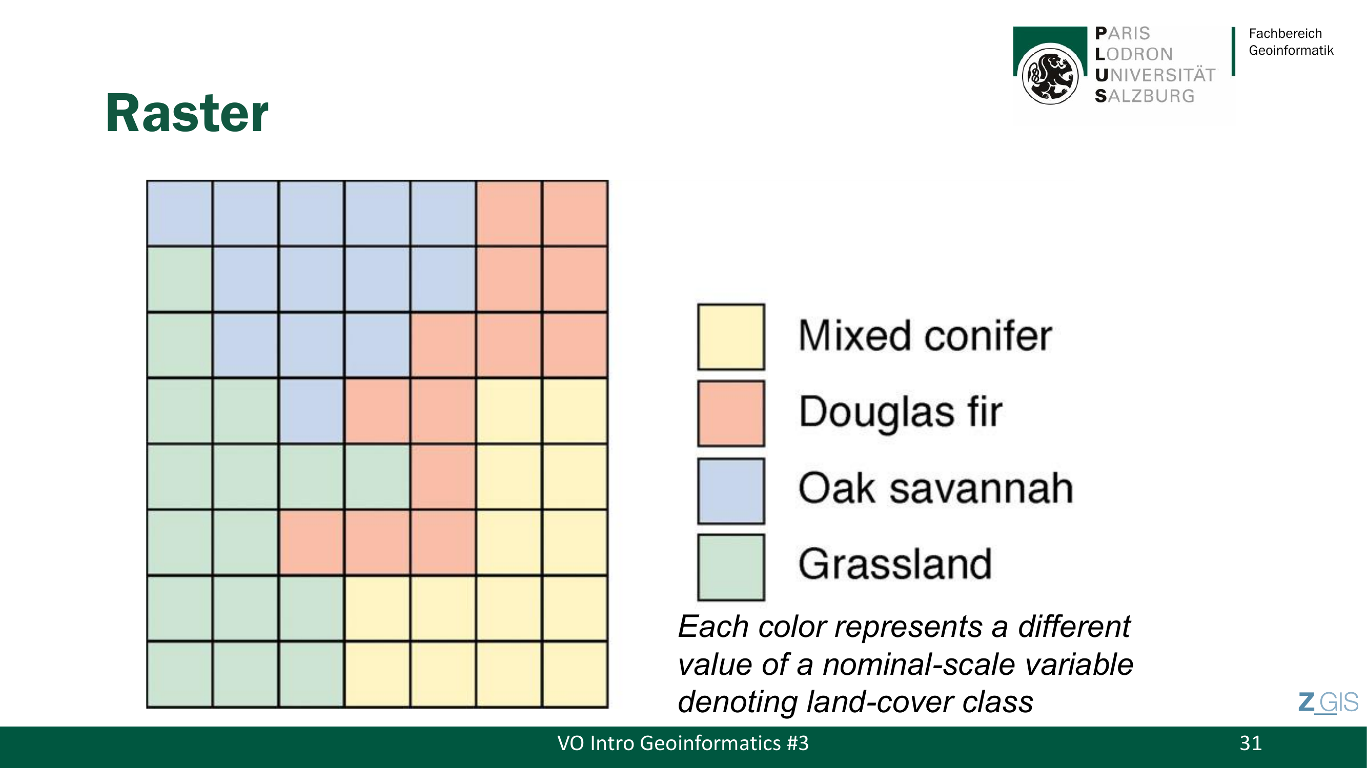 Die Zellen heissen Pixel (Picture Elements). Slide 31 zeigt ein Rasterbeispiel, in dem jede Farbe einen anderen Wert einer nominalen Variablen repraesentiert, die die Landbedeckungsklasse angibt: Mixed Conifer, Douglas Fir, Oak Savannah und Grassland.
