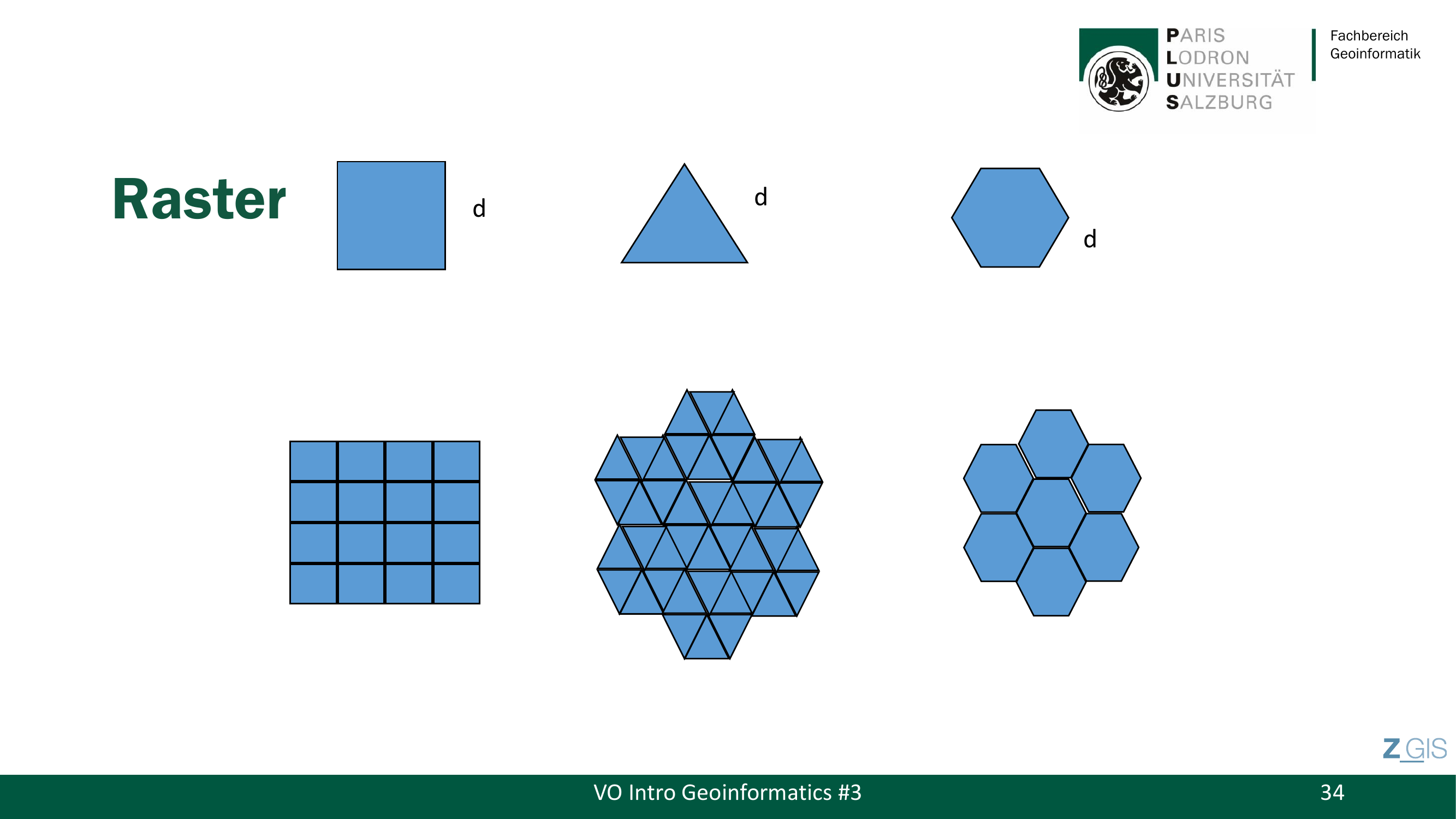 Die Dimension d eines Pixels bestimmt die Resolution (Aufloesung): die kleinste Objektgroesse, die noch erfasst werden kann. Eine Resolution von 5 m bedeutet, dass ein Pixel eine Flaeche von 5 x 5 m auf dem Boden abdeckt. Beim Rastermodell unterscheidet man zwei Formen der Zerlegung: Regulaere Tessellation (Regular Tessellation) und irregulaere Tessellation (Irregular Tessellation). Eine kontinuierliche Oberflaeche wird dabei in Grundeinheiten (Basic Units) diskretisiert.