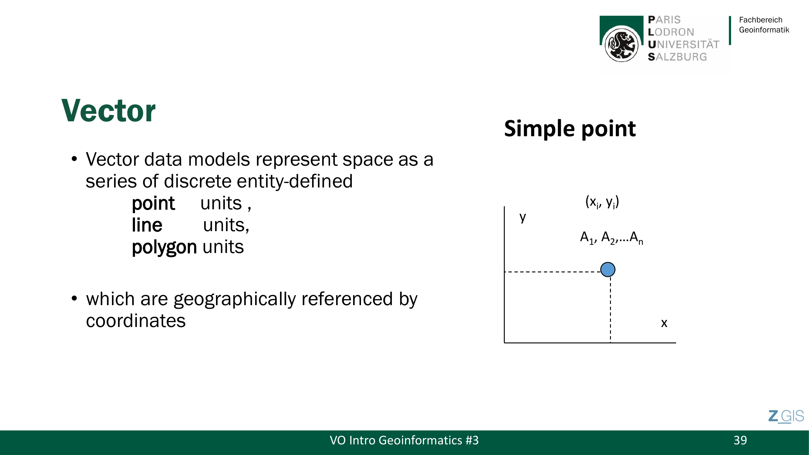 Ein Point (Punkt, 0-dimensional) wird durch ein Koordinatenpaar (x, y) definiert, dem zugehoerige Attribute A1, A2, ..., An zugeordnet werden. Beispiel: der Standort einer Messstation oder die GPS-Position eines Kindes zu einem bestimmten Zeitpunkt.