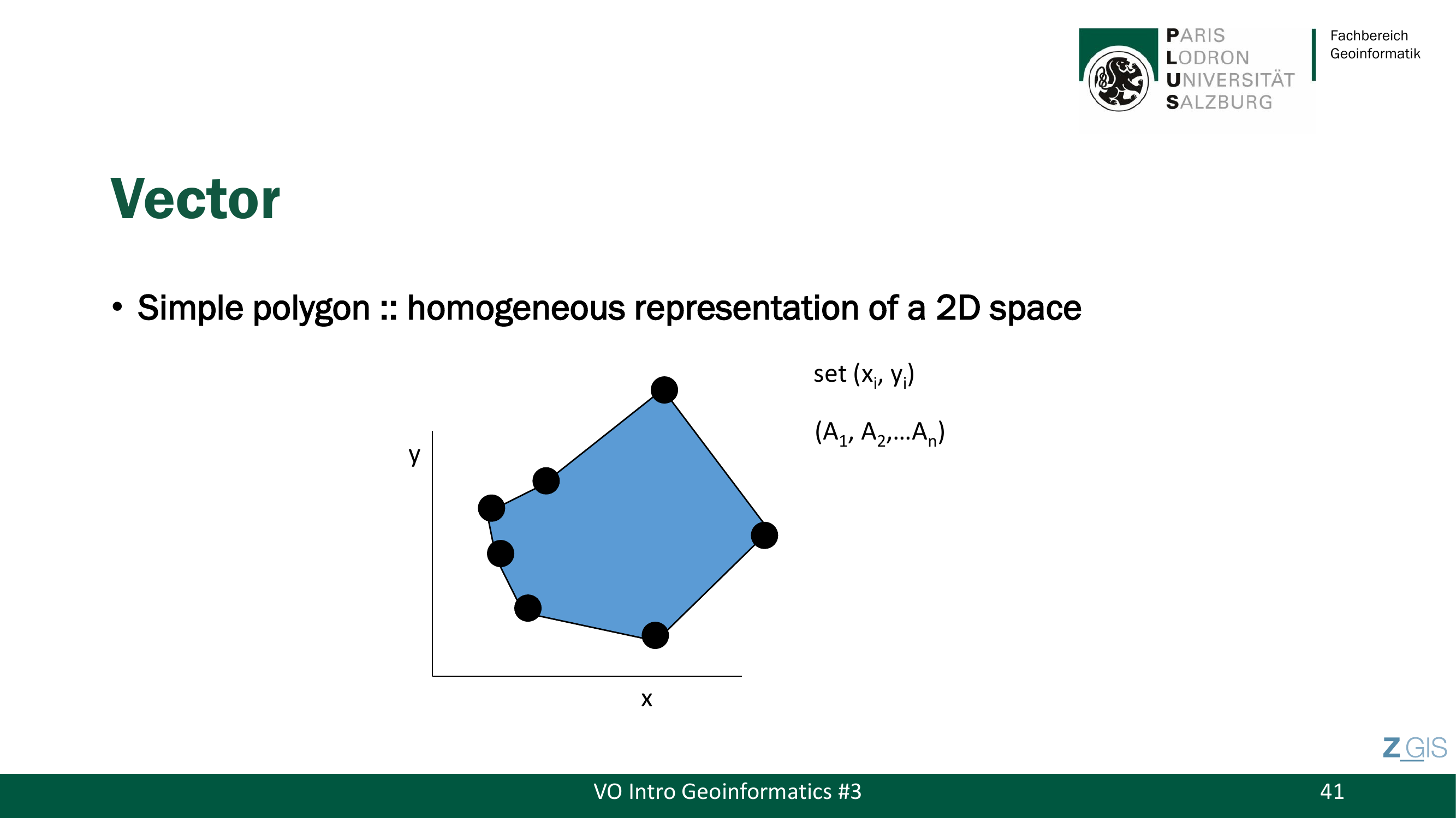 Ein Polygon (Flaeche, 2-dimensional) ist eine geschlossene Linie, bei der der erste Punkt gleich dem letzten Punkt ist. Dadurch erkennt das GIS, dass es sich um eine Flaeche und nicht um eine offene Linie handelt. Auch hier ist die Punktreihenfolge relevant. Beispiele sind Grundstuecke, Gebaeudeumrisse und Seen. Polygone sind die homogene Repräsentation eines zweidimensionalen Raumes.