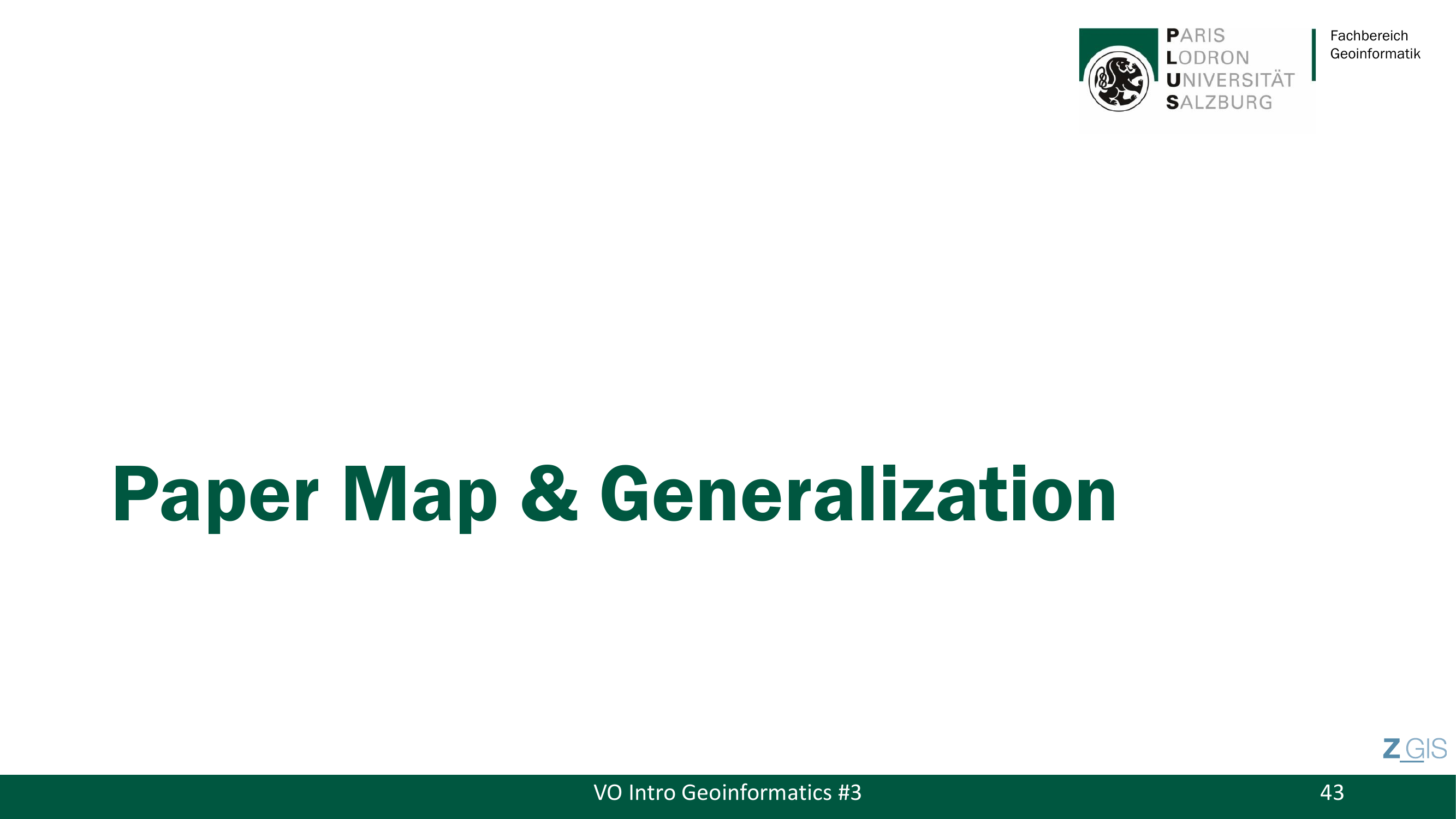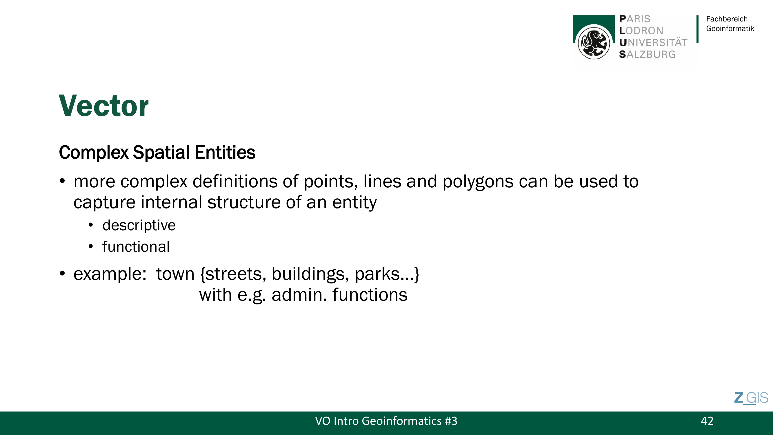 Slide 42 erwaehnt noch Complex Spatial Entities -- komplexere Definitionen von Punkten, Linien und Polygonen, die die interne Struktur einer Entitaet abbilden koennen, etwa eine Stadt bestehend aus Strassen, Gebaeuden und Parks mit administrativen Funktionen. Der Prof hat dieses Thema jedoch klar als nicht pruefungsrelevant markiert: "Don't expect a question from that one."