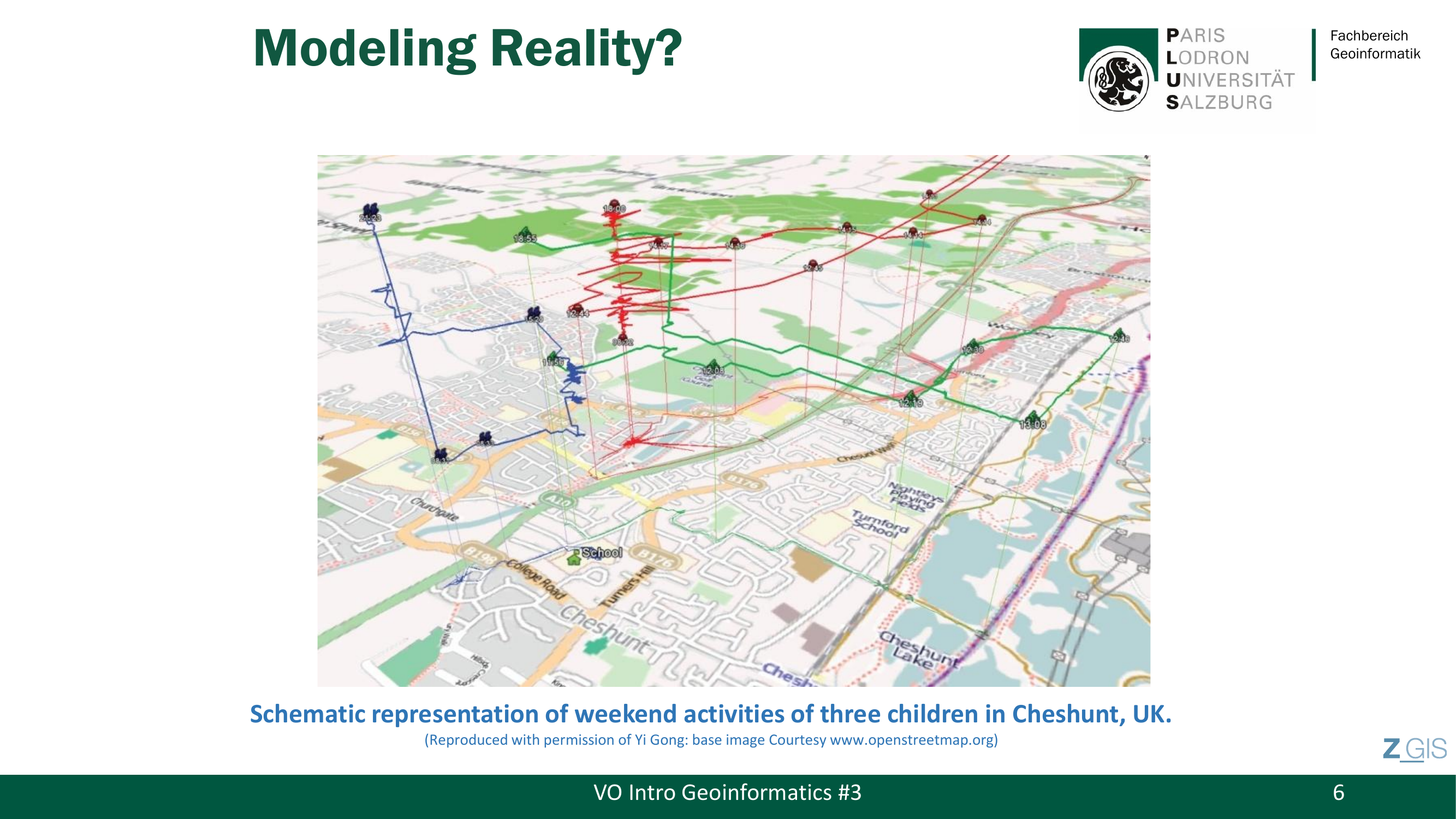 Den Einstieg in das Thema Modeling Reality macht der Prof mit einem anschaulichen Praxisbeispiel: GPS-Tracking von drei Kindern an einem Wochenende in Cheshunt, UK. Die farbigen Trajektorien auf einer OpenStreetMap-Karte zeigen, wo sich die Kinder bewegt haben, wann sie an welchem Ort waren und wie schnell sie unterwegs waren. Das kennt jeder, der schon einmal Strava oder Garmin Connect benutzt hat.