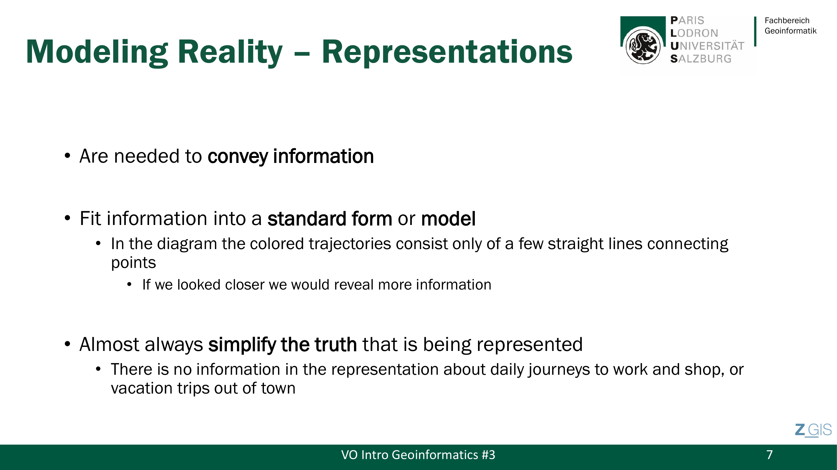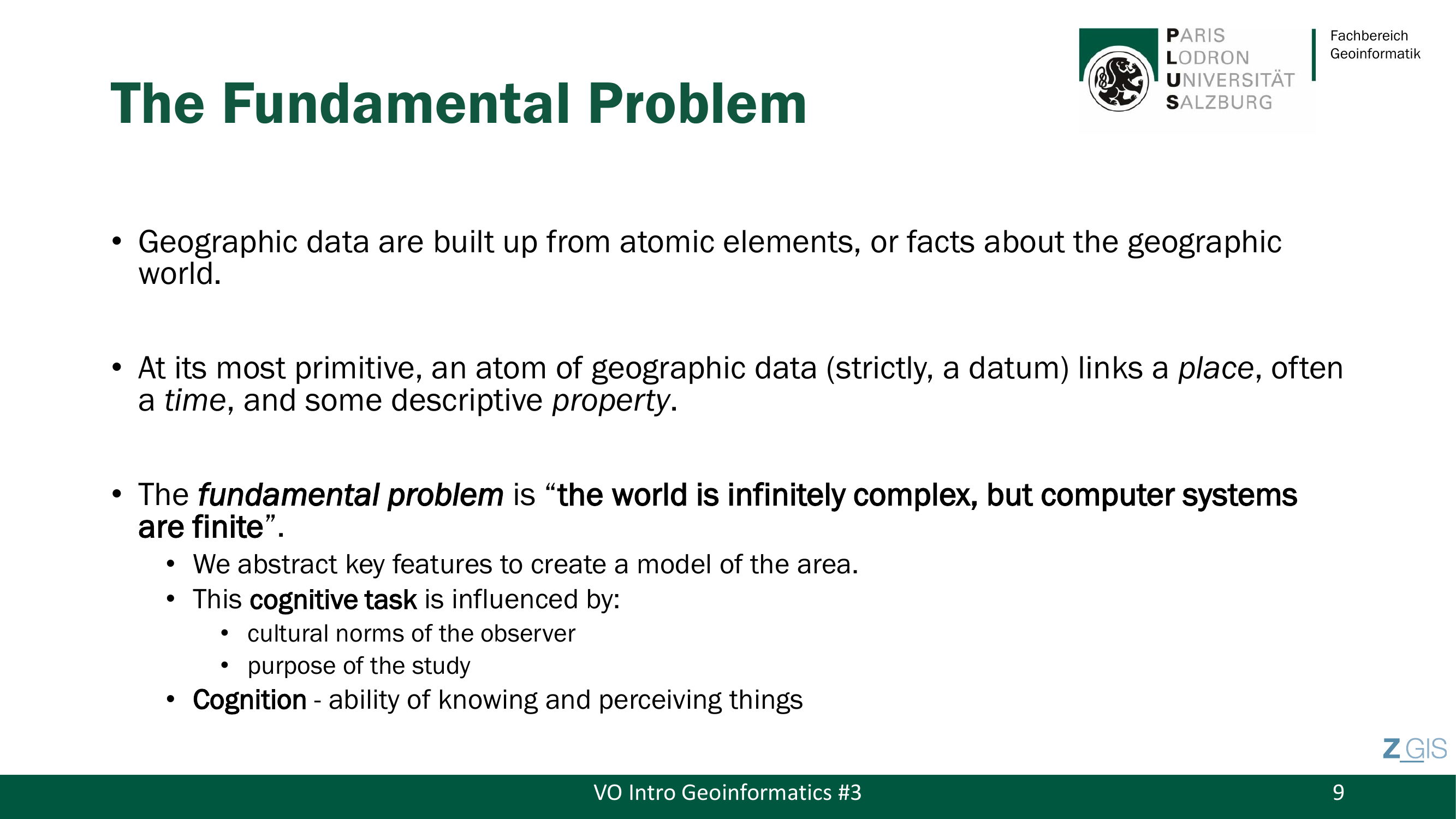 Das zentrale Problem der Geoinformatik laesst sich in einem einzigen Satz zusammenfassen: "The world is infinitely complex, but computer systems are finite." Wir koennen niemals die gesamte Komplexitaet der realen Welt im Computer abbilden, sondern muessen abstrahieren. Geographische Daten bestehen dabei aus atomaren Elementen, die drei Komponenten verknuepfen: Place (Ort), Time (Zeit) und Property (Eigenschaft). Jeder einzelne GPS-Punkt aus dem Kinderbeispiel ist ein solches Atom -- ein bestimmter Ort zu einer bestimmten Zeit mit bestimmten Eigenschaften wie Geschwindigkeit.