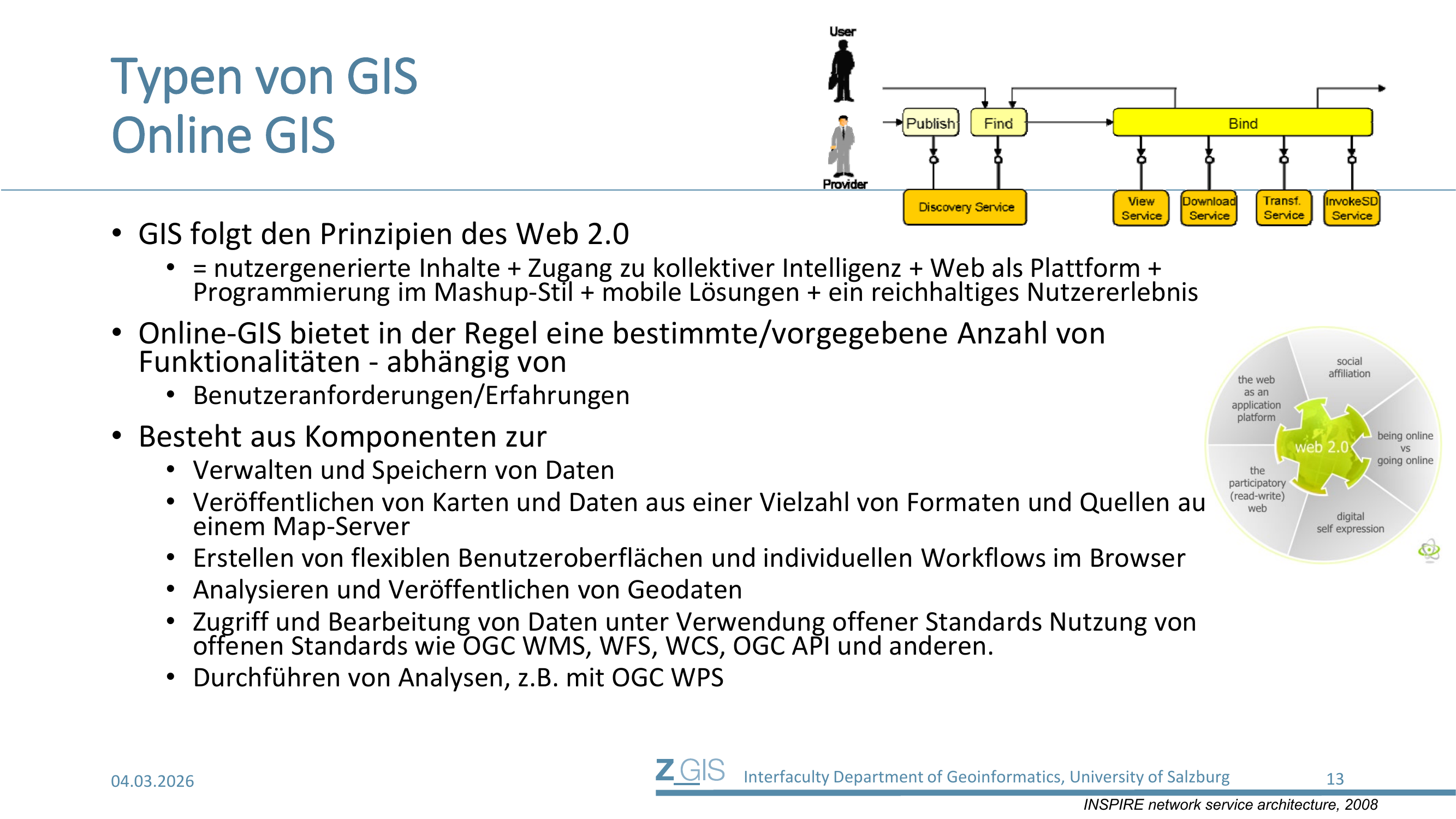 Auf Slide 13 sieht man oben das Architekturdiagramm der INSPIRE Network Service Architecture (Infrastructure for Spatial Information in the European Community). Ein Provider kann Dienste publizieren (Publish), ein User kann diese finden (Find) und sich daran binden (Bind). Die Dienste umfassen Discovery Service, View Service, Download Service, Transformation Service und Invoke Spatial Data Service.