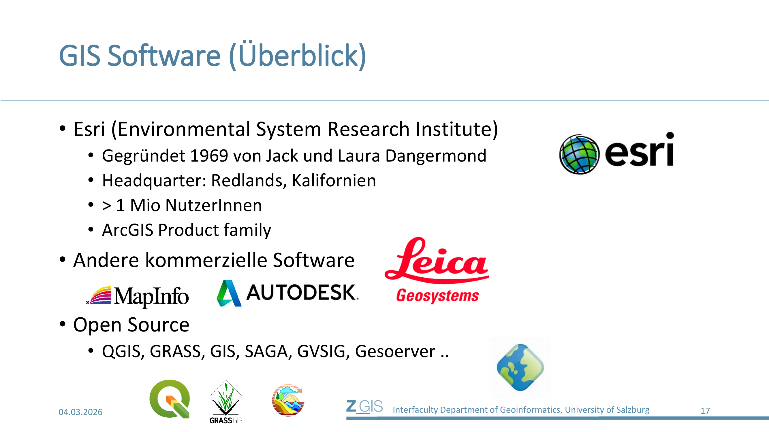 Daneben gibt es andere kommerzielle Anbieter wie MapInfo, Autodesk und Leica Geosystems. Im Open-Source-Bereich finden sich QGIS, GRASS GIS, SAGA, gvSIG und GeoServer (ein Open-Source-Server für die Bereitstellung von Geodatendiensten).