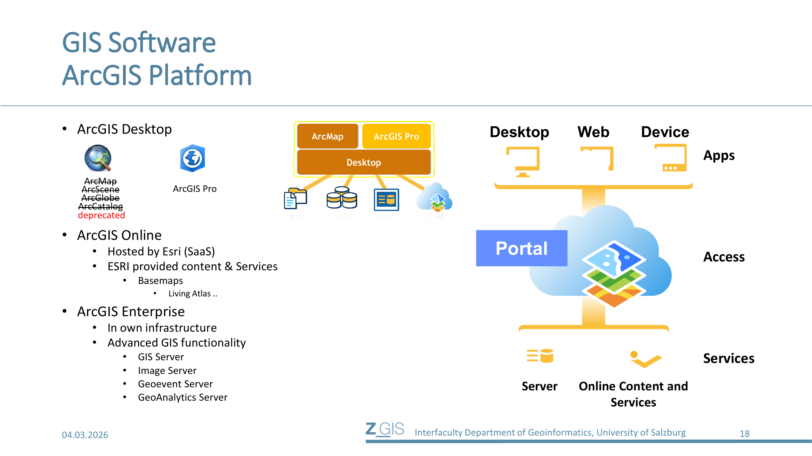 Die ArcGIS-Plattform gliedert sich in drei Säulen, wie auf Slide 18 dargestellt.