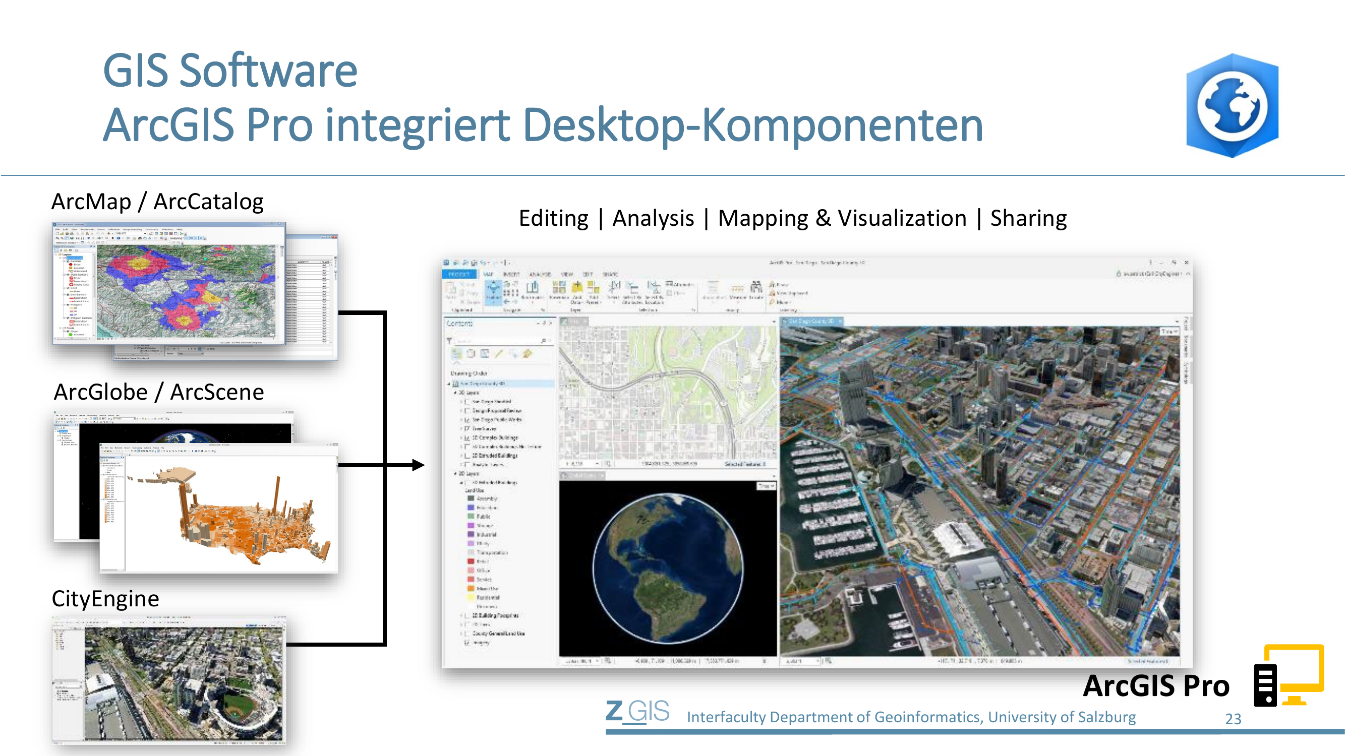 Slide 23 zeigt, wie ArcGIS Pro die früheren separaten Desktop-Komponenten integriert. Links sieht man die alten Einzelanwendungen: ArcMap/ArcCatalog für Kartierung und Datenverwaltung, ArcGlobe/ArcScene für 3D-Visualisierung, und CityEngine für 3D-Stadtmodellierung. Alle diese Funktionen - Editing, Analysis, Mapping & Visualization, Sharing - fließen nun in ArcGIS Pro zusammen.